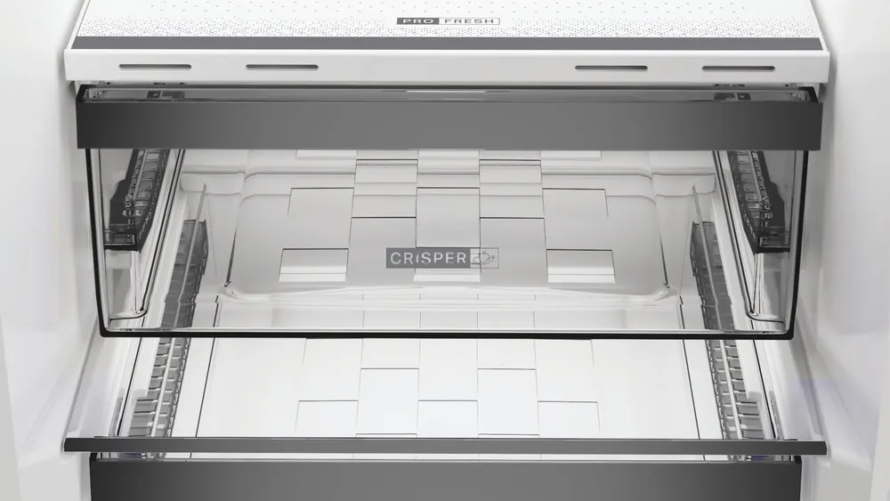 Drugim elementem jest Metal MultiFlow. W chłodziarce zastosowano metalową tylną ściankę, która działa jako bufor cieplny i pomaga rozprowadzać chłód po większej powierzchni. Ma to ograniczać lokalne różnice temperatury i przyspieszać powrót do ustawionych parametrów po otwarciu drzwi. Rynek rzadko podaje porównywalne dane liczbowe opisujące skalę tego efektu – nie bez powodu. Podobne rozwiązanie stosują też inni producenci; w lodówkach marki Hisense pojawia się nazwa „Metal-Tech Cooling”, która odnosi się do metalowego panelu stabilizującego temperaturę w komorze. Kolejna funkcja to ProFresh. Opis dotyczy kontroli wilgotności w szufladzie na warzywa i owoce poprzez układ wylotów powietrza oraz perforowaną półkę. Konstrukcja ma ograniczać skraplanie i jednocześnie zmniejszać utratę wilgoci z produktów. W przechowalnictwie świeżych owoców i warzyw wysoka wilgotność względna ogranicza ubytki masy i utratę jędrności. Skala efektu w domowej lodówce zależy jednak od sposobu użytkowania, częstotliwości otwierania drzwi, ilości produktów oraz ich opakowania.