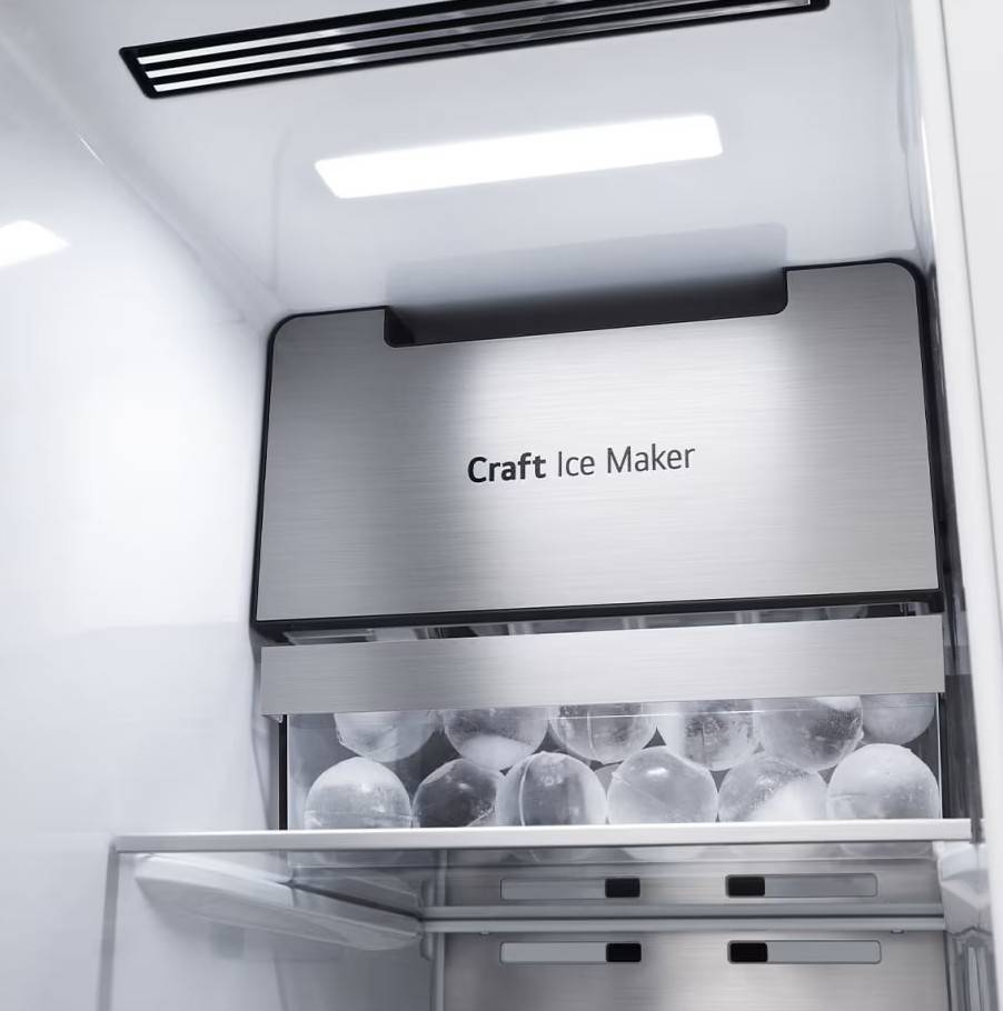 LG GSXV90MCDE wyposażono w system Craft Ice™, który automatycznie przygotowuje partie wolno topniejących kul lodu, a funkcja Craft Ice+ w aplikacji LG ThinQ® pozwala przyspieszyć ich produkcję.