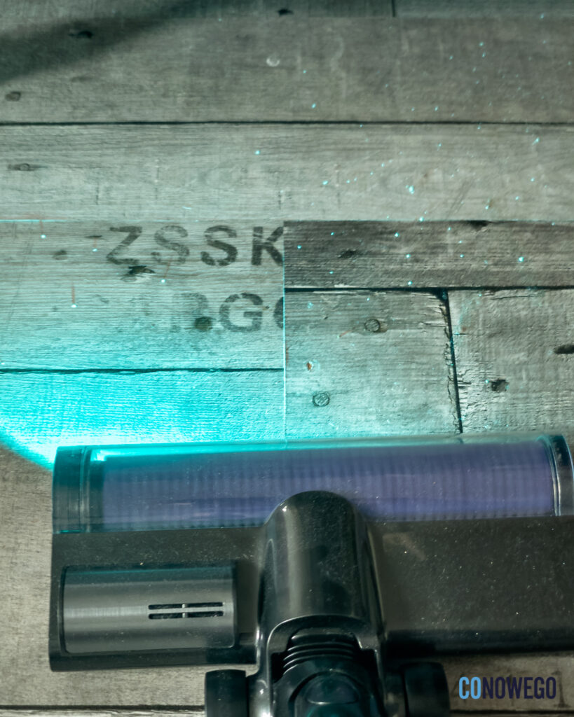 Nie można też nie docenić oświetlenia podłogi podczas odkurzania. Zielona dioda z boku elektroszczotki podłogowej idealnie pokazuje, gdzie są niewidoczne z wysokości zabrudzenia (OptiInsight, kąt 140°) i ułatwia ocenę jakości sprzątania. Na dywanie może nie być przydatne, ale na moich pstrokatych panelach nie wyobrażam sobie sprzątania bez takiej pomocy. Bardzo mnie cieszy, że tego elementu nie zabrakło w tym niedrogim modelu.