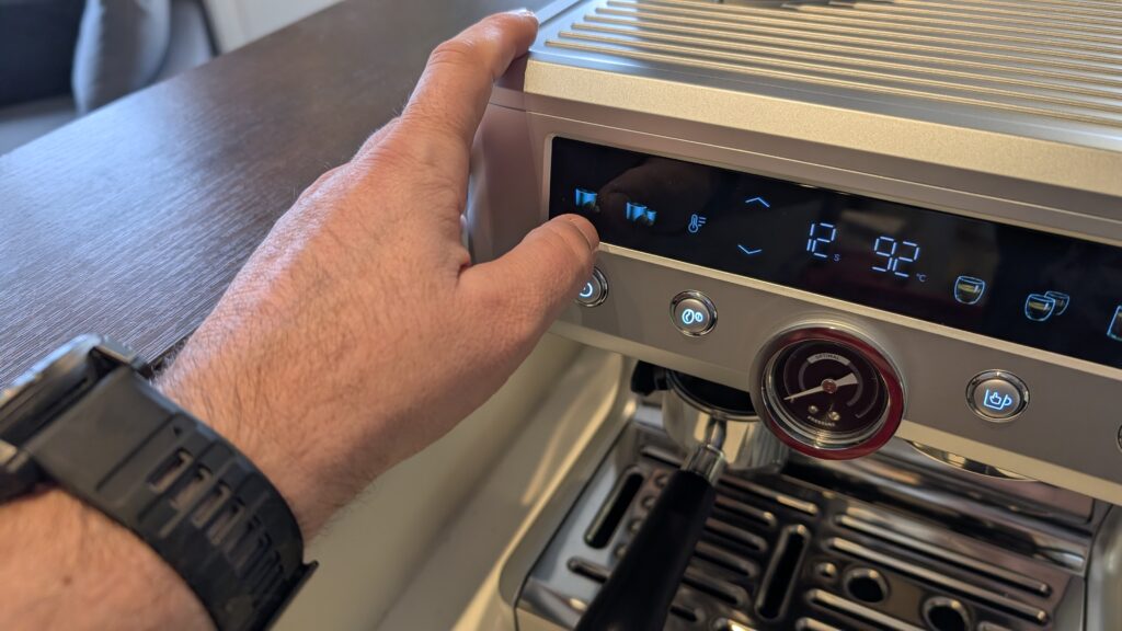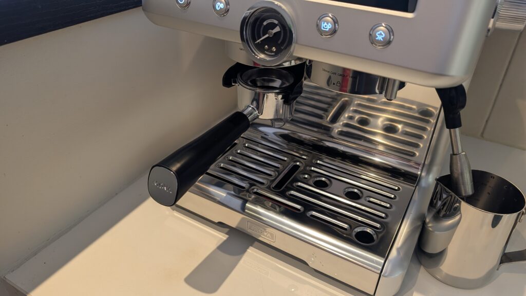 Tak to prawda, że przygotowanie kawy w ekspresie kolbowym wymaga więcej pracy niż w automatycznym, ale nie są to dni ani godziny, ale zaledwie sekundy. Choć automat zrobi nam kawę w 30 sekund, to obyty z kolbowym ekspresem użytkownik zrobi to niecałą minutę. Jednak czas nie do końca ma znaczenia dla smakoszy kawy, bo najważniejsze jest to, żeby zachować pełen rytuał i finalnie rozsmakować się w pysznym napoju. Choć wiem, że to mało ekonomiczne rozwiązanie, to najlepszym, byłoby mieć w domu dwa urządzenia. Mova S20 Pro składa się z jednostki centralnej, czyli samego urządzenia, które jest duże, ciężkie i solidnie wykonane. Sam wygląd jest lekko vitntage, przypomina urządzenia z lat 30, lub 40 tych. Górna platforma jest podgrzewana, co przyspiesza efekt wysychania mokrych filiżanek. Obok znajduje się pojemnik na ziarna, u którego podstawy znajduje się ruchomy pierścień służący do regulacji stopnia mielenia ziaren. Od frontu jest panel sterowania, który częściowo składa się wyświetlacza dotykowego, a częściowo z przycisków fizycznych. Centralnie w okrągłym okienku znajdziemy manometr, który pokazuje ciśnienie bojlera. Poniżej znajdziemy wylot młynka, w którym umieszczamy kolbę na zmielone ziarna, a po prawej jest głowica zaparzająca, w której umieszczamy kolbę. Obok głowicy znajduje się bały kranik, jest to dysza do gorącej wody. Skrajnie z prawej strony znajdziemy lance do spieniania mleka. Na dole klasycznie jest taca ociekowa z czujnikiem/pływakiem poziomu wody. Na prawej ścianie umieszczono pokrętło sterujące, którym wybieramy gorącą parę do spieniania mleka albo gorącą wodę, np. żeby zaparzyć Americane. Na plecach umieszczono pojemny zbiornik na wodę. Konstrukcja jest prosta i dość intuicyjna, nie sposób się pomylić, a ja swoją pierwszą kawę przygotowałem bez pomyłek, a co ważniejsze smakowała wybornie.