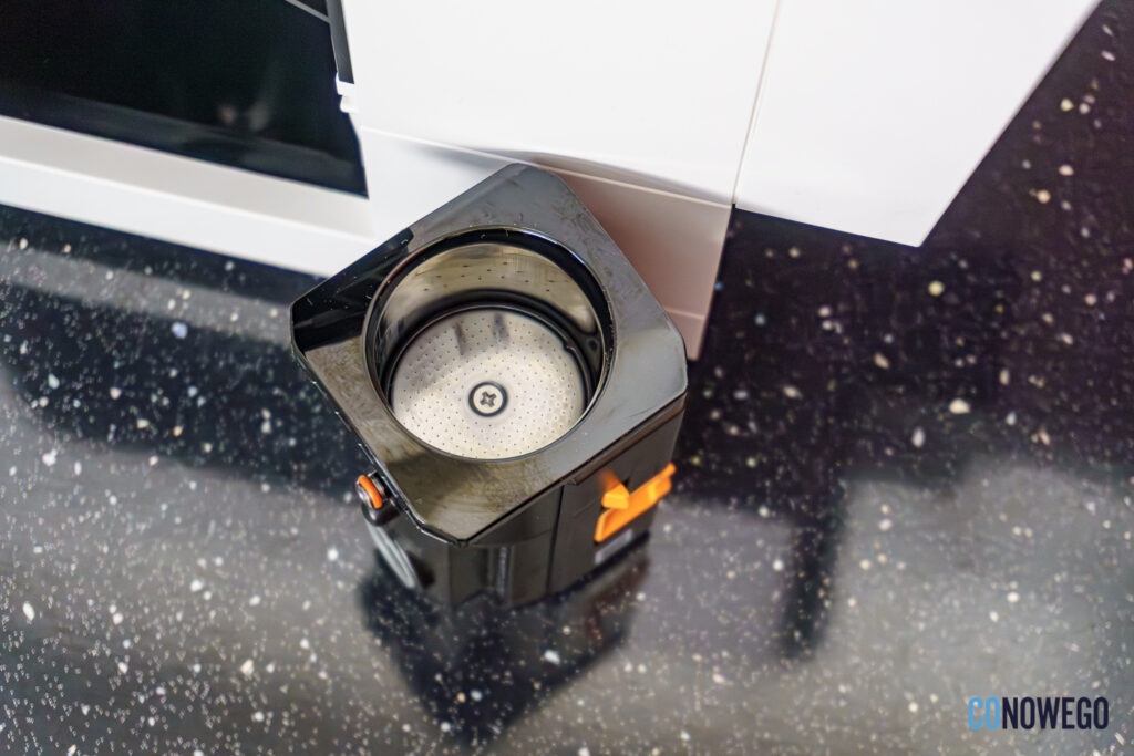 Pod podstawką na filiżanki jest oczywiście także ociekacz, do którego spłynie woda po czyszczeniu urządzenia. Nie jest od przymocowany żadnym zatrzaskiem, więc trzeba go dokładnie odstawiać na miejsce. Za to banalnie łatwo mogę go opróżnić. Fusy zbierane są w osobnym pojemniku w głębi ekspresu, trzeba go opróżnić co 10 porcji. W domowych warunkach nie jest to uciążliwe. Choć różne kawy przygotowane przez ekspres MOVA są przepyszne i mają bogaty aromat, żadne z nas nie da rady wypić aż pięciu dziennie, byśmy musieli codziennie wyrzucać fusy (lub robić z nich domowy peeling – polecam).