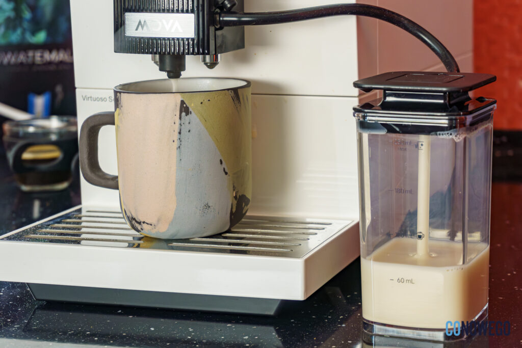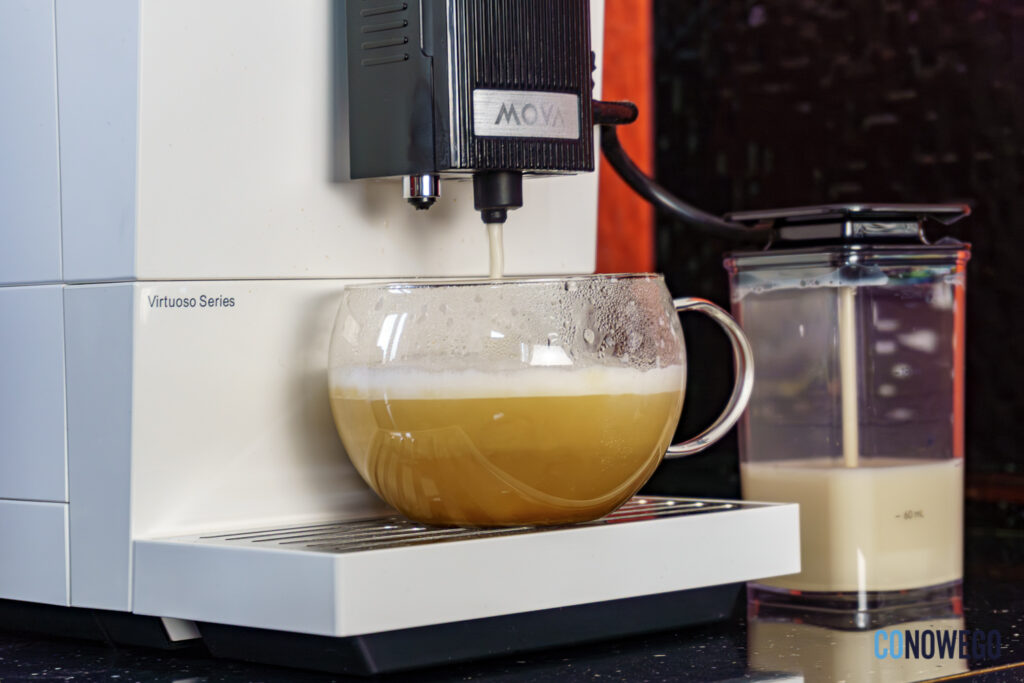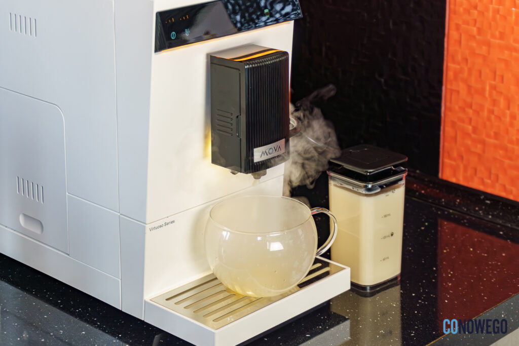 Przedostatni przycisk na panelu służy do spieniania mleka i uzupełnia filiżankę około 100 ml delikatnej pianki, dzięki czemu ekspres daje możliwość przygotowywania własnych kaw mlecznych. Dzięki temu można zmodyfikować cappuccino czy latte. Dostępna jest też możliwość dolania gorącej wody do kawy, gdy najdzie mnie ochota na long coffee.