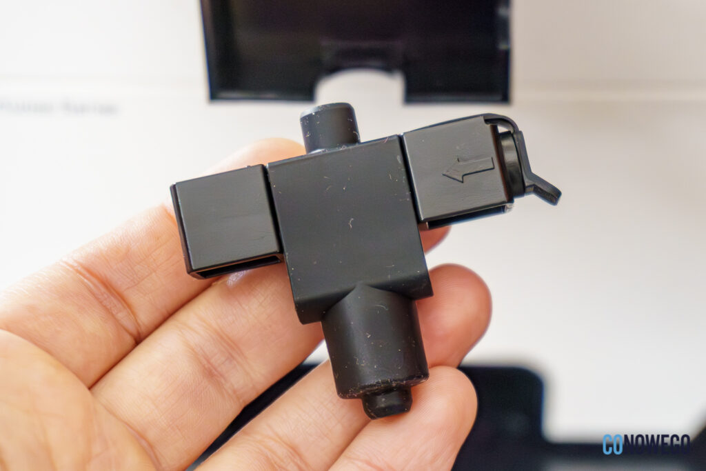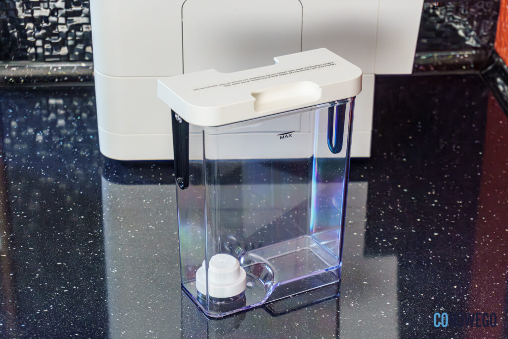 Ponadto w zestawie znajduje się niewielki pojemnik na mleko, który podłącza się do ekspresu krótkim wężykiem. To oczywiście opcjonalne – gdy pojemnik nie jest używany, można zatkać wejście gumowym koreczkiem.