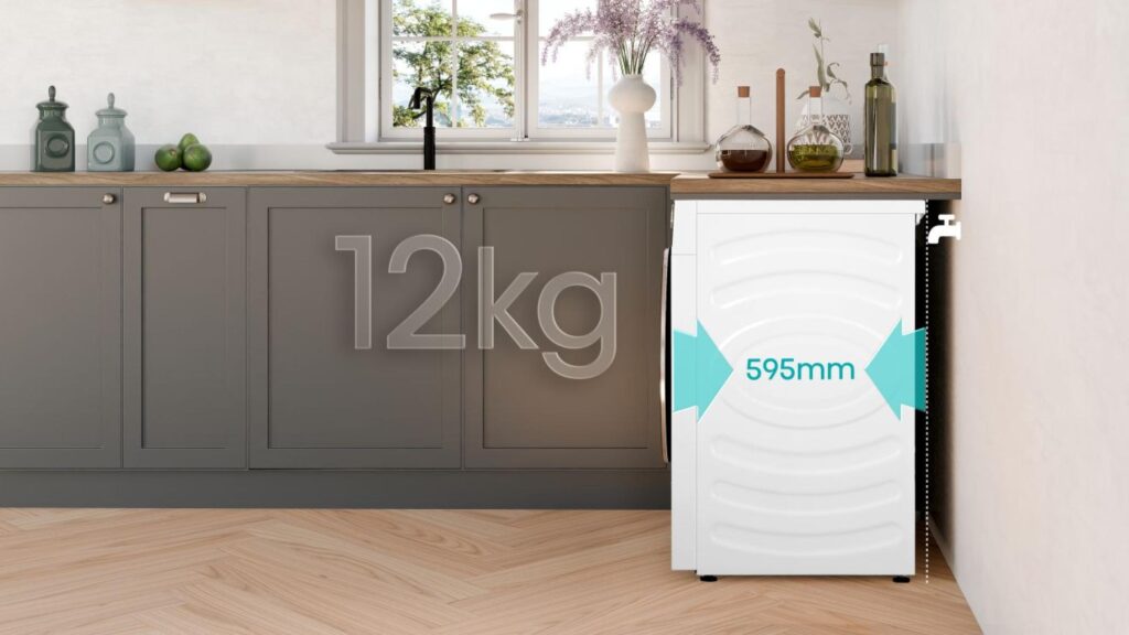 Warto zauważyć, że urządzenia pralnicze Hisense 5I wizualnie nie różnią się znacznie od sztandarowej serii 7S. Wszystkie mają modną obecnie bryłę o prostych krawędziach i eleganckie drzwiczki wykończone hartowanym i przyciemnionym szkłem. Ta „kanciastość” sprawia, że urządzenia są idealne do zabudowy i odnajdą się także pod blatami. Największa z pralek została poniżej pokazana pod blatem kuchennym. Na brytyjskiej stronie Hisense dobre dopasowanie do blatów kuchennych (kitchen fit) jest wymienione wśród główny zalet tej serii.
