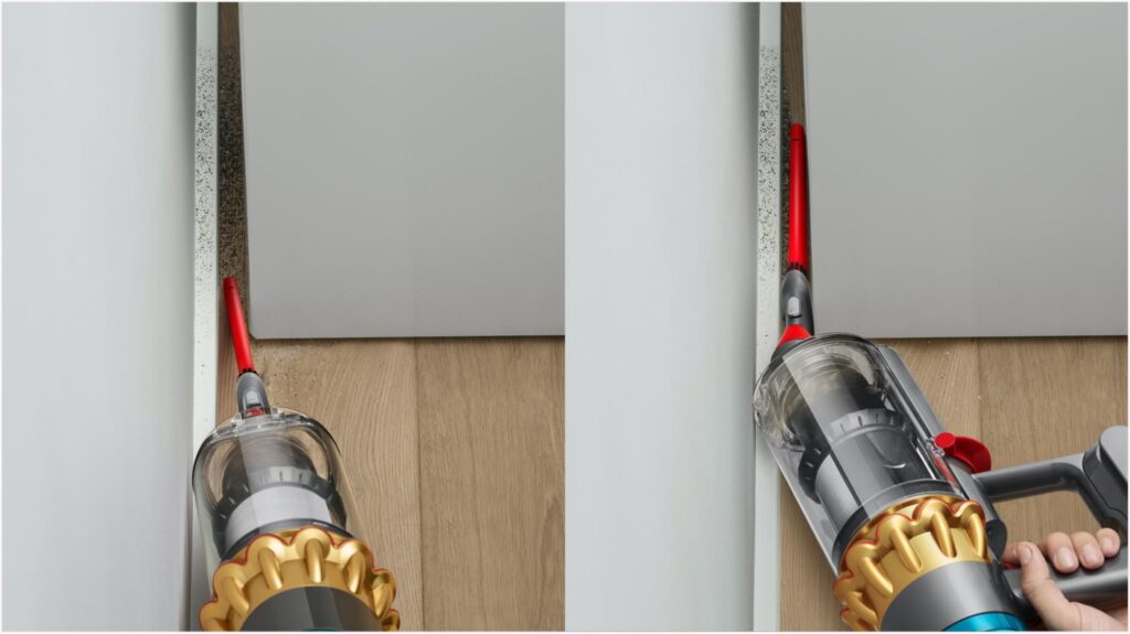 Odkurzaczem warto jak najczęściej sięgać także pod meble i za nie. Można tam znaleźć prawdziwe skarby – kolczyk, słuchawkę TWS, pieniądze… dlatego moim zdaniem szalenie cenne są relatywnie cienkie szczotki, takie jak ta powyżej. No i nie wyobrażam sobie już życia bez długiej, elastycznej szczelinówki do sięgania między szafki czy pod lodówkę. Poniższa końcówka szczelinowa to produkt Dysona. Pochodzi z zestawu V16 Piston Animal, ale można dokupić ją także do innych modeli. Dyson genialnie rozwiązał problem szczelin przy ścianach i dał szczelinówce ruchomy montaż. Dzięki temu kąty są czyste, a ściany i sam odkurzacz nie są poobijane.