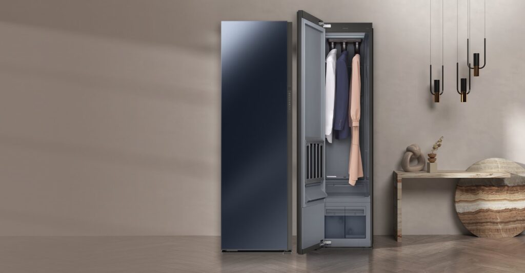 Możesz też zaszaleć i sprawić sobie szafę parową. To nie żart – Samsung ma w ofercie AirDresser, czyli szafę parową. Możesz dodać je do wyposażenia garderoby i na bieżąco dezynfekować tekstylia. Ubrania powieszone na wieszakach z dmuchawami zostaną odświeżone i przy okazji unikniesz prasowania.