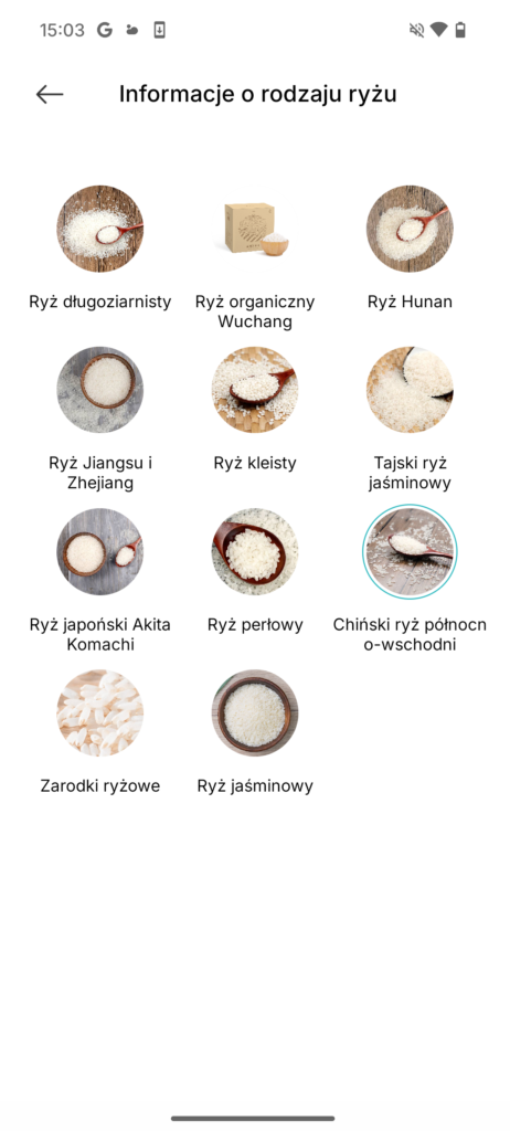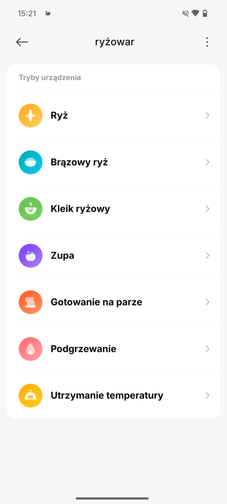Aplikacja mobilna przyda się, jeśli zboczysz z utartego szlaku. To tu możesz wybrać rodzaj gotowanego białego ryżu spośród kilkunastu predefiniowanych ustawień gatunkowych. Czy to naprawdę są różne programy? Może to tylko losowe obrazki, a pod nimi ten sam preset? Testy sugerują, że Xiaomi raczej nie kantuje. Różnice są jednak bardzo małe i nie mam pewności, że to na pewno typ ryżu je wprowadza.