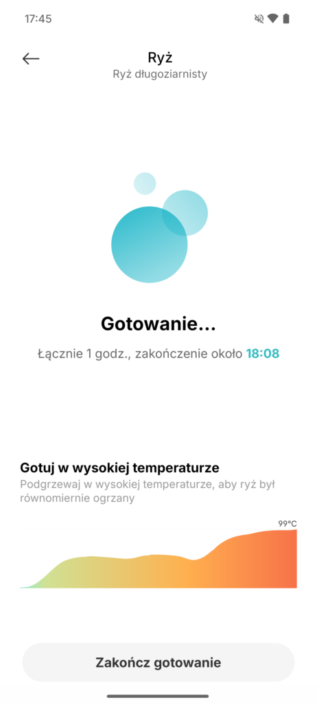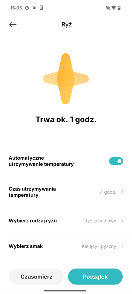 Ponadto jest tu więcej ustawień timera i utrzymania ciepła. Zdalny dostęp jest jednak ograniczony. Można uruchomić i zatrzymać program, ale nie da się włączać i wyłącza urządzenia z telefonu. Trzeba podejść i nacisnąć guziczek. Nie wpływa to negatywnie na komfort użytkowania. Inteligentne czy nie, urządzenie do gotowania ryżu samo sobie ziaren nie nasypie. I tak piłeczka jest po mojej stronie.