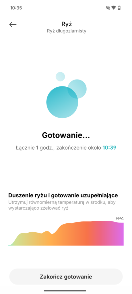 Każdy z białych gatunków można ugotować od al dente do miękkiego i lepkiego. Z przyjemnością stwierdzam, że to nie atrapa. Te ustawienia mają zaskakująco duży wpływ na teksturę finalnego produktu. Jest tu nawet suwak pozwalający wybrać twardość i wizualizacja zmian temperatury. W czasie gotowania białego ryżu możesz zaś przeczytać opisy kolejnych etapów. Sympatyczny dodatek dla początkujących.