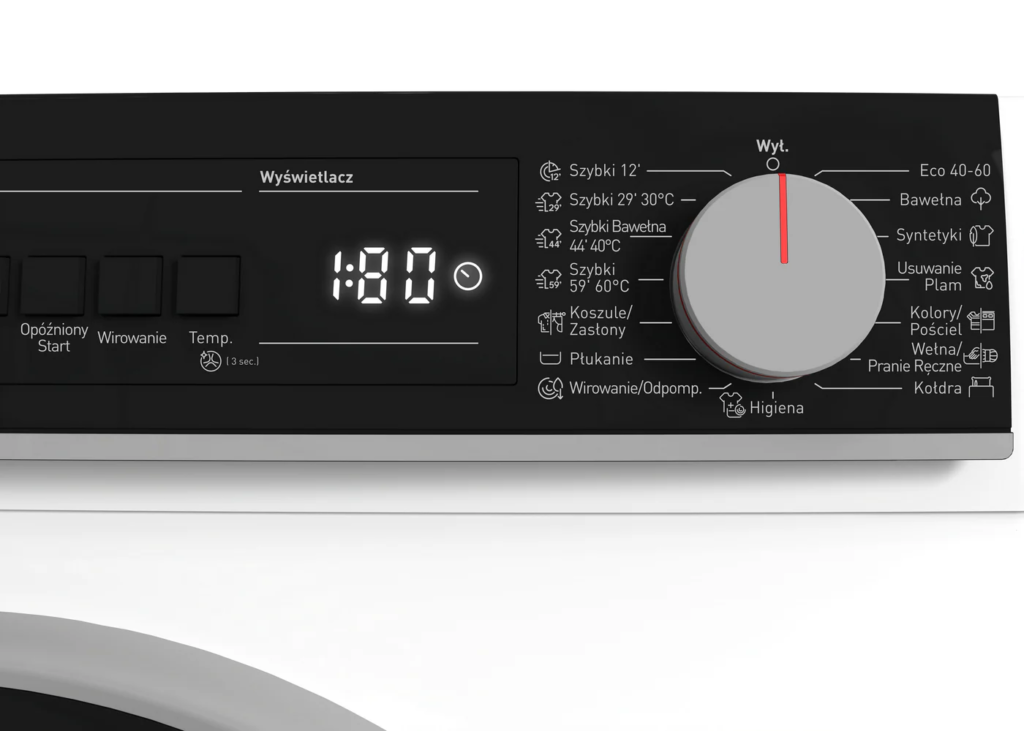 Trzeci element osi to wirowanie. 1200 obr./min przy klasie wirowania B i wilgotności resztkowej 53,4% oznacza w praktyce, że pranie będzie zauważalnie bardziej wilgotne niż w modelach 1400 obr./min o bardzo dobrych parametrach odwirowania (choć wiele pralek 1400 rpm nadal ma klasę B i różnice bywają mniejsze, niż sugeruje sama liczba obrotów). Jeśli ktoś suszy na balkonie może to być obojętne. Jeżeli jednak pranie trafia regularnie do suszarki bębnowej, dodatkowe kilka punktów procentowych wilgotności może przekładać się na dłuższy czas suszenia i większy koszt energii po stronie suszarki. Wreszcie hałas 75 dB i klasa B. To poziom, który w wielu mieszkaniach będzie „do zaakceptowania”, ale w przypadku prania nocnego w małym M2 może być odczuwalny zwłaszcza jeśli łazienka graniczy ze sypialnią. W opisach sprzedażowych pojawia się informacja o redukcji wibracji (Wave Cabinet), ale etykieta hałasu jest tu najlepszym, porównywalnym punktem odniesienia.