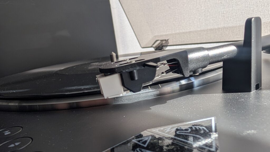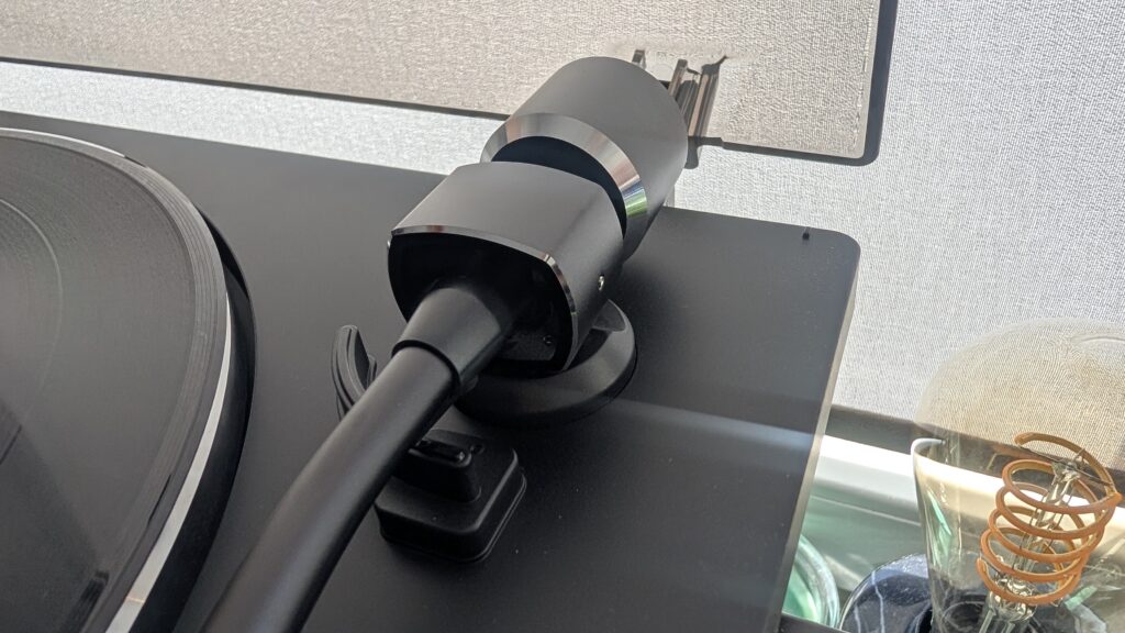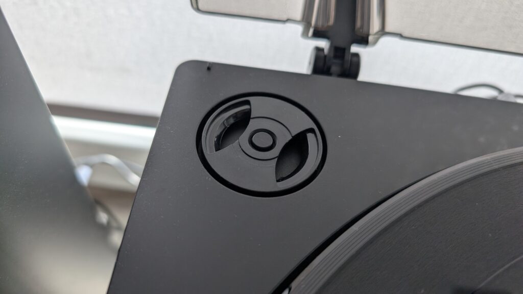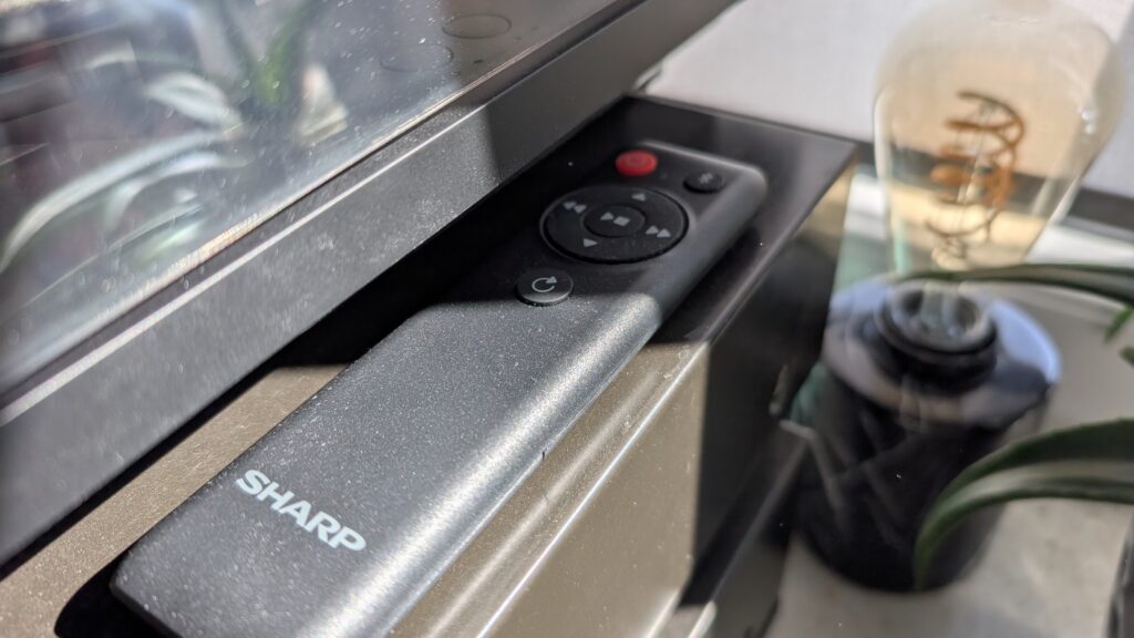 To właśnie w sekcji obsługi Sharp RP-TT100 pokazuje swoją najbardziej awangardową twarz. Mamy tu do czynienia z w pełni automatycznym ramieniem, które umożliwia odtwarzanie płyt dosłownie jednym dotknięciem. Wystarczy położyć krążek, wybrać odpowiedni rozmiar nośnika (7- lub 12-calowy) oraz prędkość obrotową (33 i 1/3 lub 45 obrotów na minutę), a gramofon sam podniesie igłę, nakieruje ją na rozbiegówkę i delikatnie opuści. Prawdziwym szokiem dla tradycjonalistów będzie jednak wspomniany wcześniej pilot oraz zaimplementowane funkcje. Za pomocą zdalnego sterowania możemy z odległości wymusić start i stop, a mechanizm ramienia pozwala na specyficznie zrealizowane przewijanie do przodu i do tyłu (poprzez automatyczne unoszenie i przesuwanie ramienia nad odpowiednie partie płyty) oraz odtwarzanie ciągłe (zapętlenie strony). Z perspektywy użytkownika to rozwiązanie genialne dla osób, które traktują muzykę w tle i nie chcą co 20 minut wstawać z fotela, by manualnie odkładać igłę na podpórkę.