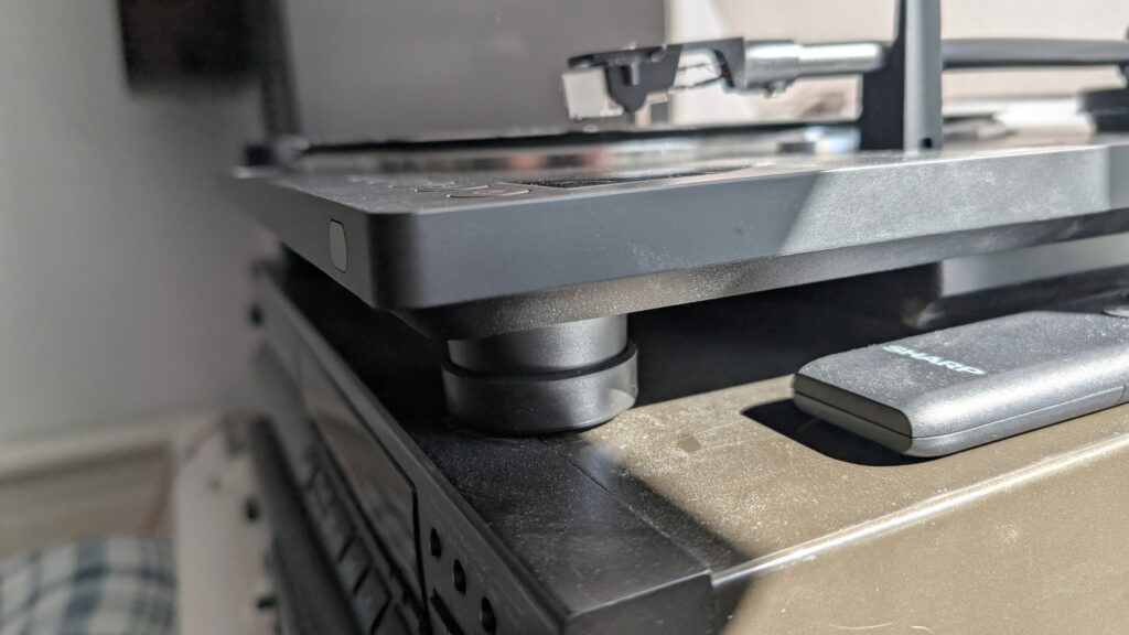 Rozpakowywanie gramofonu to zawsze specyficzny rytuał, a w przypadku Sharpa RP-TT100 zaczynamy od zlokalizowania wszystkich niezbędnych elementów układanki. W kartonie, oprócz samej bazy urządzenia o wymiarach 420 x 360 x 105 mm, znajdujemy aluminiowy talerz, grubą gumową matę tłumiącą wibracje, przezroczystą pokrywę przeciwkurzową, zasilacz sieciowy oraz podstawowy kabel RCA. Bryła gramofonu jest minimalistyczna, choć niestety zdominowana przez tworzywa sztuczne, co przy wadze zaledwie 3,5 kg sprawia, że urządzenie jest dość podatne na wstrząsy zewnętrzne. Frontowy panel zdobią cztery fizyczne przyciski odpowiedzialne za zmianę prędkości obrotowej (33 1/3 oraz 45 RPM), parowanie Bluetooth oraz start i stop odtwarzania. Ramię jest masywne, proste, aluminiowe i pozbawione możliwości regulacji siły nacisku (tzw. antyskatingu), co jest standardowym, choć zawsze bolesnym kompromisem w gramofonach z tej półki cenowej. Całość prezentuje się jednak zgrabnie, a matowe, czarne wykończenie skutecznie maskuje odciski palców, dzięki czemu sprzęt nie wygląda jak policyjna karta daktyloskopijna po jednym dniu użytkowania.