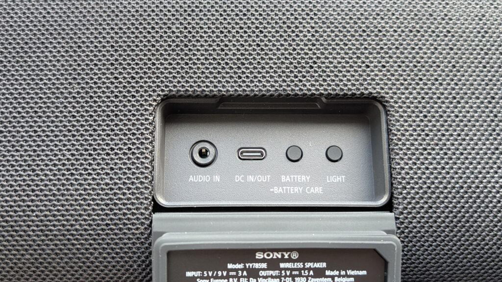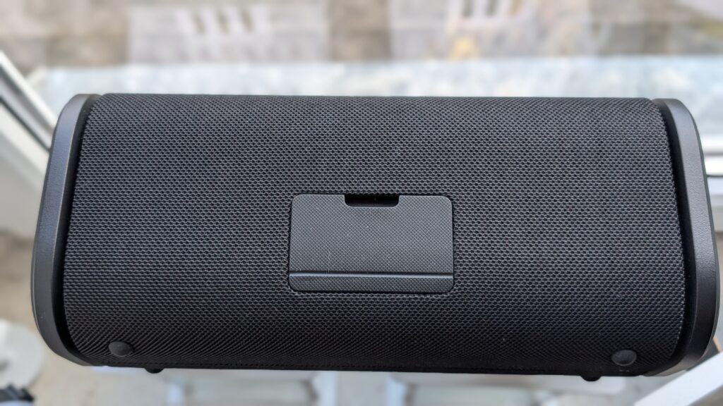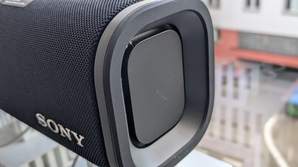 Od pierwszego kontaktu z Field 5 czuć, że to sprzęt, na którym nie oszczędzano. Sony postawiło na jakość, która daje natychmiastowe poczucie dobrze wydanych pieniędzy i pewność, że głośnik przetrwa trudy niejednej imprezy. Jego odporność potwierdzają dwie kluczowe cechy: Wodoodporność i pyłoszczelność oraz Solidna budowa. W pierwszym temacie certyfikat IP67 oznacza, że głośnik jest w pełni chroniony przed pyłem i wytrzyma krótkotrwałe zanurzenie w wodzie. Deszcz na grillu czy piasek na plaży nie stanowią dla niego problemu. Natomiast w drugim temacie, to zwarta konstrukcja, gumowane krawędzie chronią pasywne radiatory, a całość pokryta jest mocnym materiałem tekstylnym. Głośnik sprawia wrażenie, jakby był gotowy znieść naprawdę wiele. Jednym z najbardziej innowacyjnch elementów jest sprytny mechanizm mocowania paska na ramię. Zamiast stałych, wystających uchwytów, Sony zastosowało gumowe zaślepki, które po wyjęciu i odwróceniu odsłaniają pętle do zaczepienia paska. To jeden z tych drobiazgów, które uwielbiam w dobrym projektowaniu – proste, skuteczne i niewidoczne, gdy nie jest potrzebne. Brawa dla Sony za to rozwiązanie.