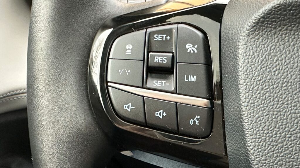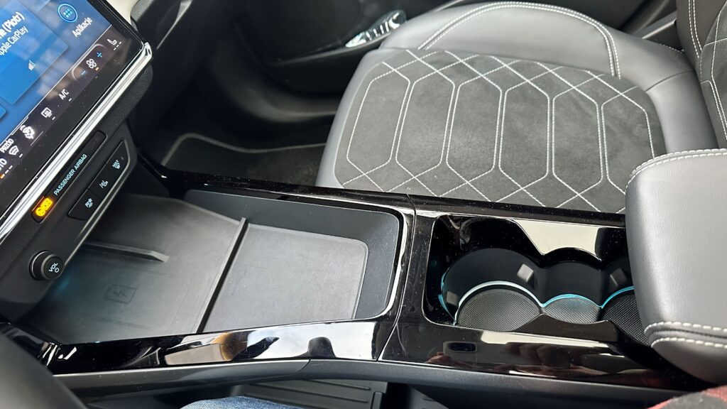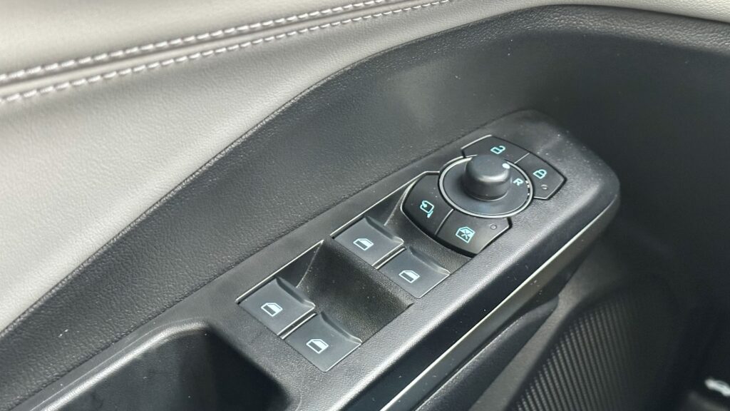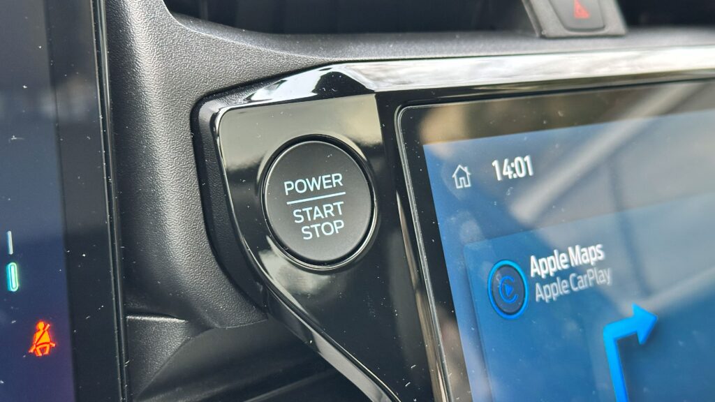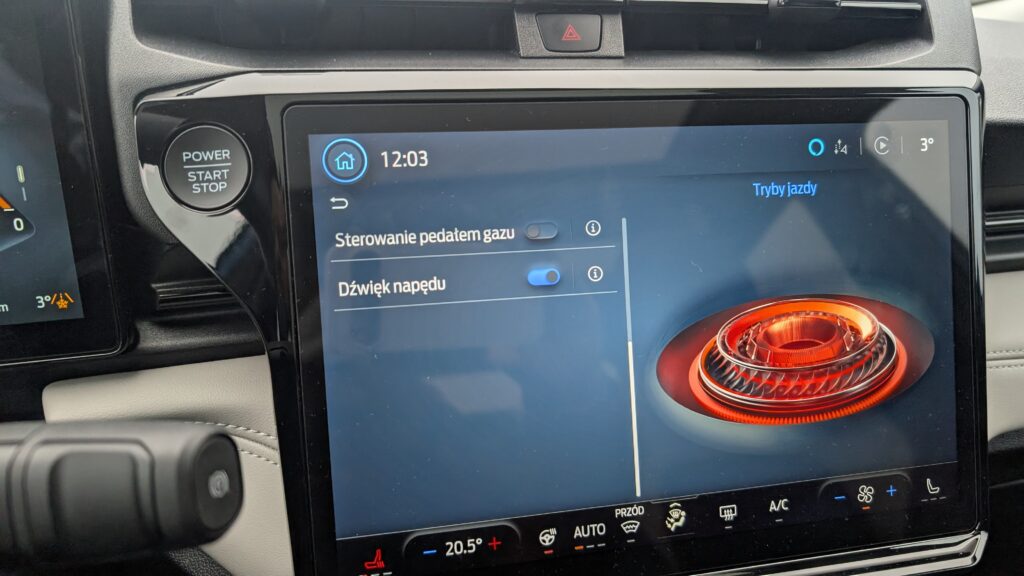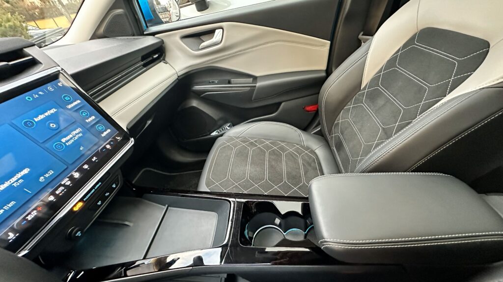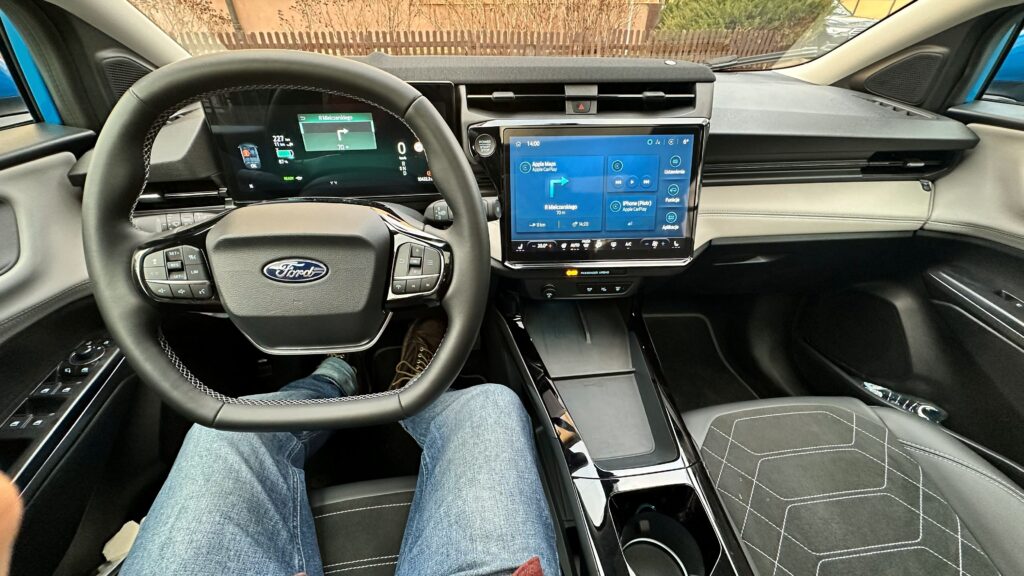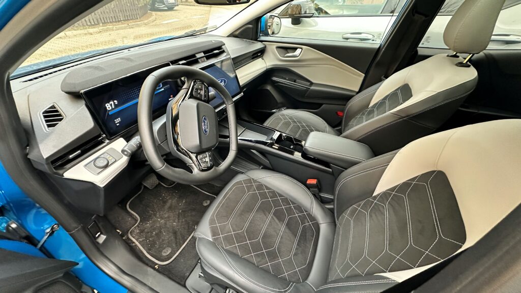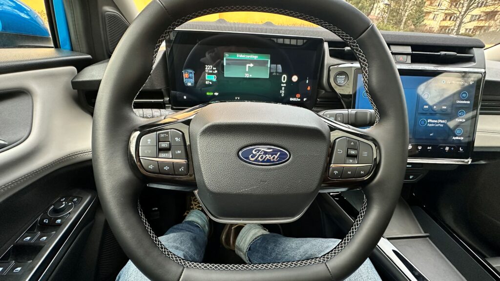 Wnętrze samochodu to królestwo cyfryzacji i nowoczesnych materiałów, które od razu po zajęciu miejsca za spłaszczoną u dołu, sportową kierownicą, dają poczucie obcowania z zaawansowaną technologią. Przed oczami kierowcy znajduje się konfigurowalny, 12,8-calowy cyfrowy zestaw wskaźników, płynnie przechodzący w centralny, 12-calowy ekran dotykowy systemu infotainment SYNC 4. Deska rozdzielcza została zaprojektowana minimalistycznie – uwagę zwraca stylowy soundbar systemu audio Bang & Olufsen, który biegnie przez szerokość kokpitu, zapewniając doskonałe brzmienie. Sterowanie nawiewem oraz multimediami przeniesiono niemal całkowicie na ekran dotykowy, co uporządkowało konsolę środkową, pozostawiając jedynie niezbędne przyciski fizyczne. Na tunelu między fotelami znajdziemy indukcyjną ładowarkę, wygodny podłokietnik kryjący schowek, a także innowacyjny schowek o dużej pojemności, natomiast selektor trybów jazdy znajduje się w kolumnie kierownicy.