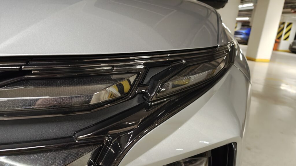 Wygląd zewnętrzny Hyundaia Tucsona to majstersztyk, który projektanci określają mianem „Parametrycznej Dynamiki”, co w praktyce oznacza grę ostrych linii, kątów i geometrycznych wzorów. Przód samochodu zdominowany jest przez spektakularny grill, w który wkomponowano innowacyjne światła do jazdy dziennej, nazwane „Parametric Hidden Lights”. Gdy samochód jest wyłączony, elementy te wyglądają jak ciemny chromowany grill, jednak po uruchomieniu silnika boczne sekcje atrapy rozbłyskują jasnym światłem LED, tworząc efekt skrzydeł anioła, co nadaje autu unikalną sygnaturę świetlną. Boki nadwozia są równie imponujące, pełne ostrych przetłoczeń i załamań w kształcie litery „Z”, które sprawiają, że samochód wygląda dynamicznie nawet, gdy stoi w miejscu, a nadkola o kanciastym obrysie podkreślają jego terenowy charakter.