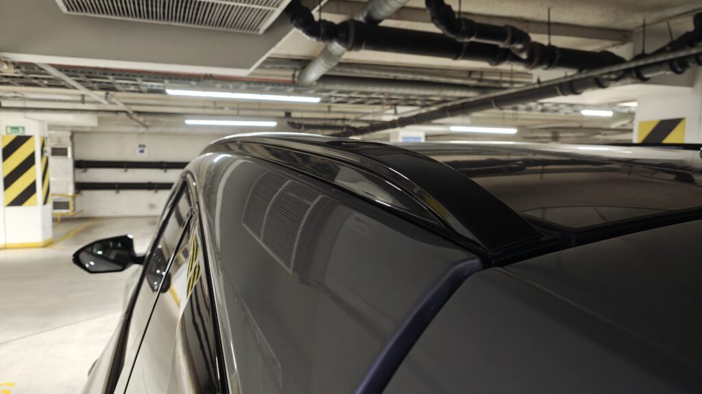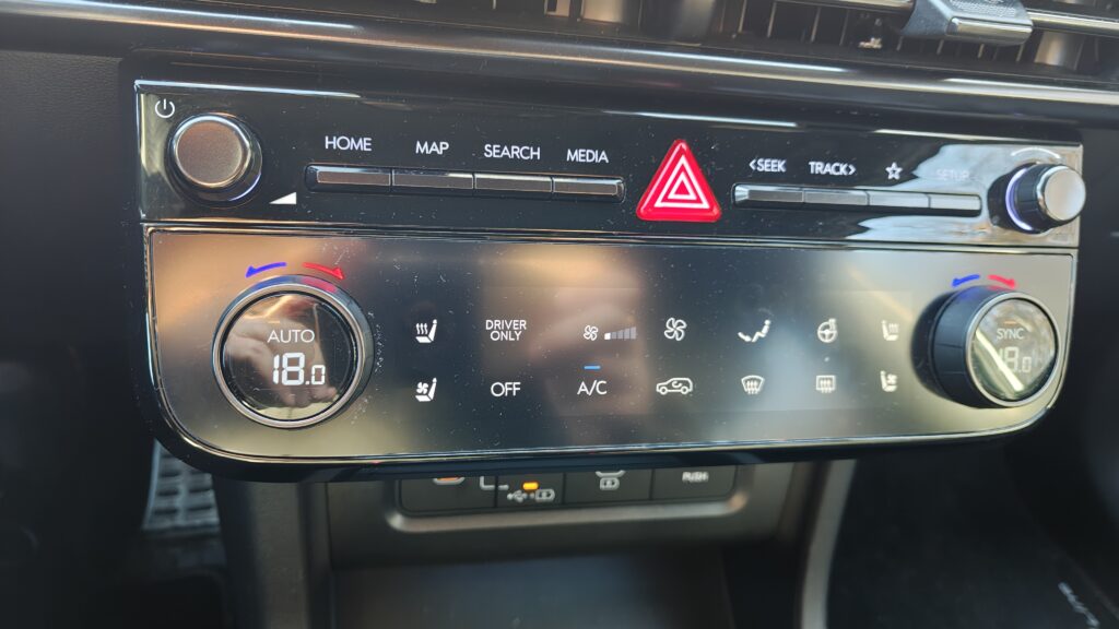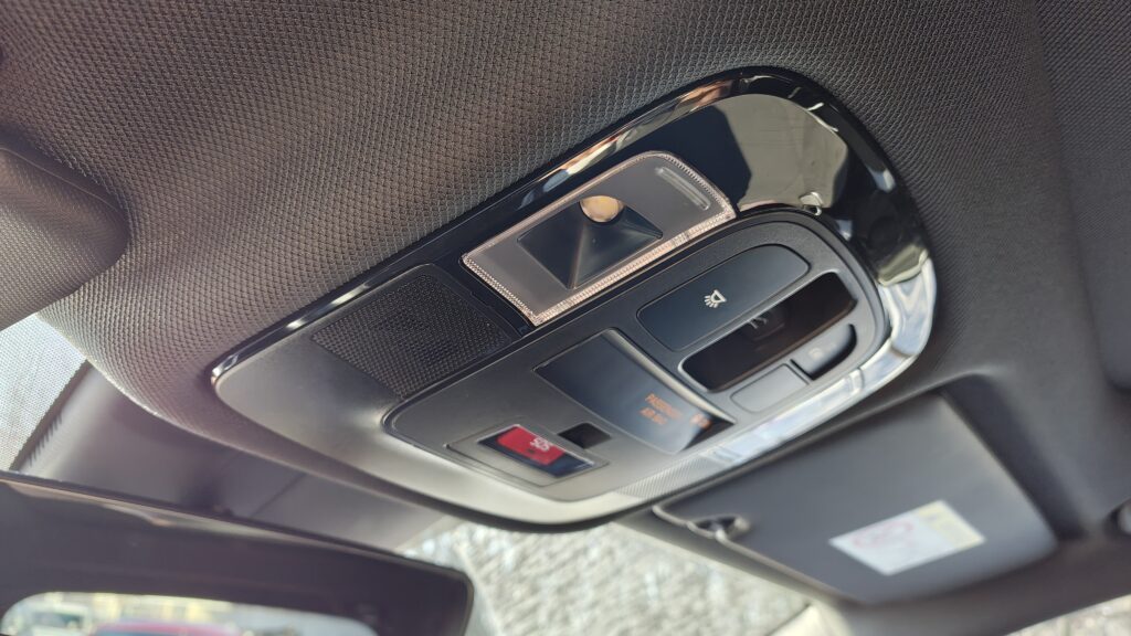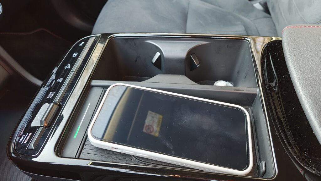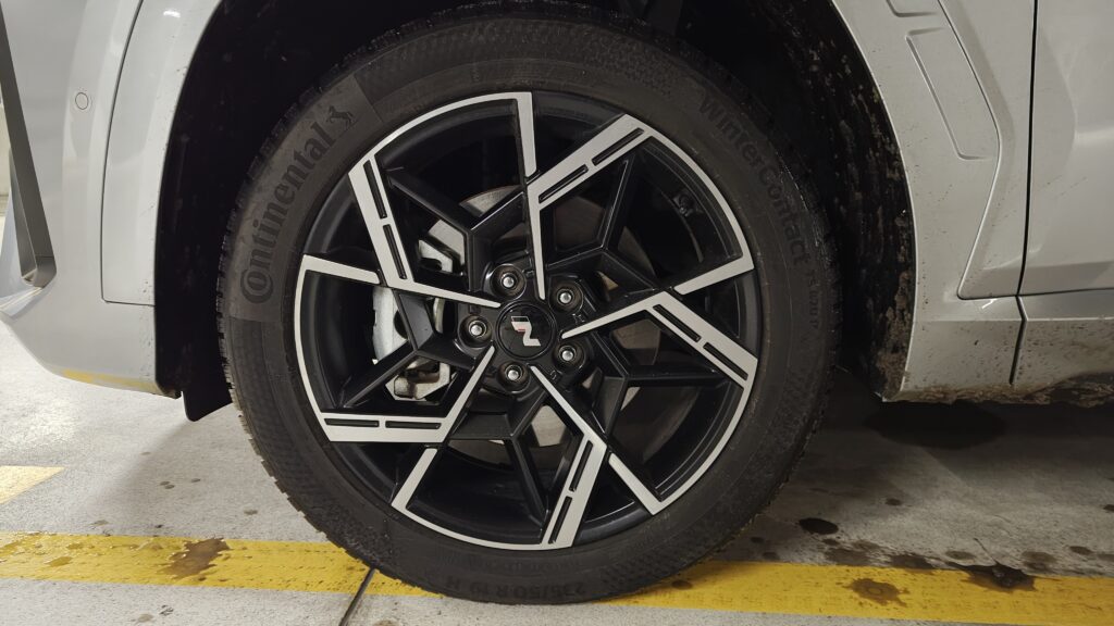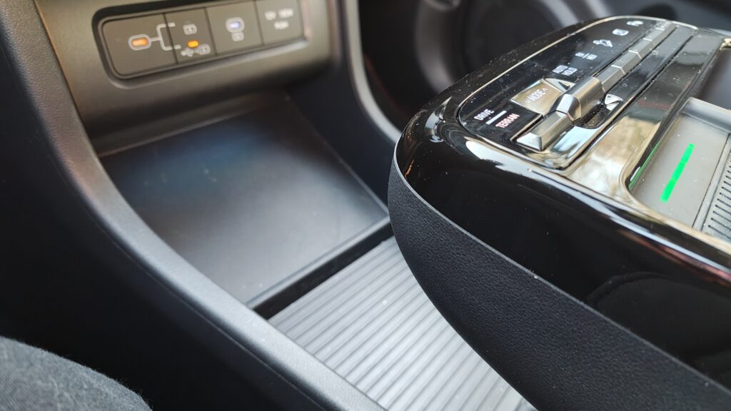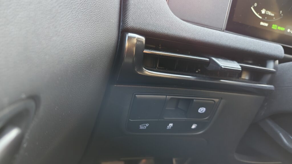 Deska rozdzielcza została zaprojektowana w stylu „wodospadu”, gdzie linie łagodnie opadają od podszybia ku dołowi, płynnie przechodząc w boczki drzwiowe, co tworzy wrażenie otulenia pasażerów. Centralnym punktem jest duży ekran dotykowy systemu multimedialnego, pod którym umieszczono panel sterowania klimatyzacją; w testowanej wersji jest on dotykowy, ale reaguje precyzyjnie i jest logicznie rozplanowany. Na kolumnie kierownicy znajdziemy nowoczesny system zmiany biegów. Obudowa tunelu środkowego między fotelami mieści przyciski do sterowania podgrzewaniem i wentylacją foteli, włącznik asystenta zjazdu oraz przełącznik trybów jazdy, a także dwa duże uchwyty na kubki i wygodny podłokietnik.