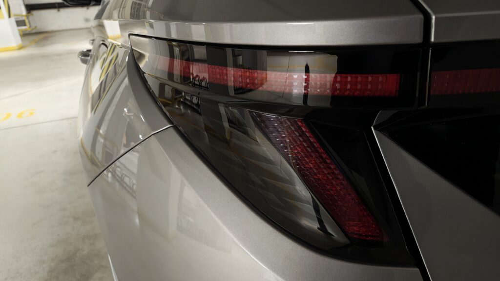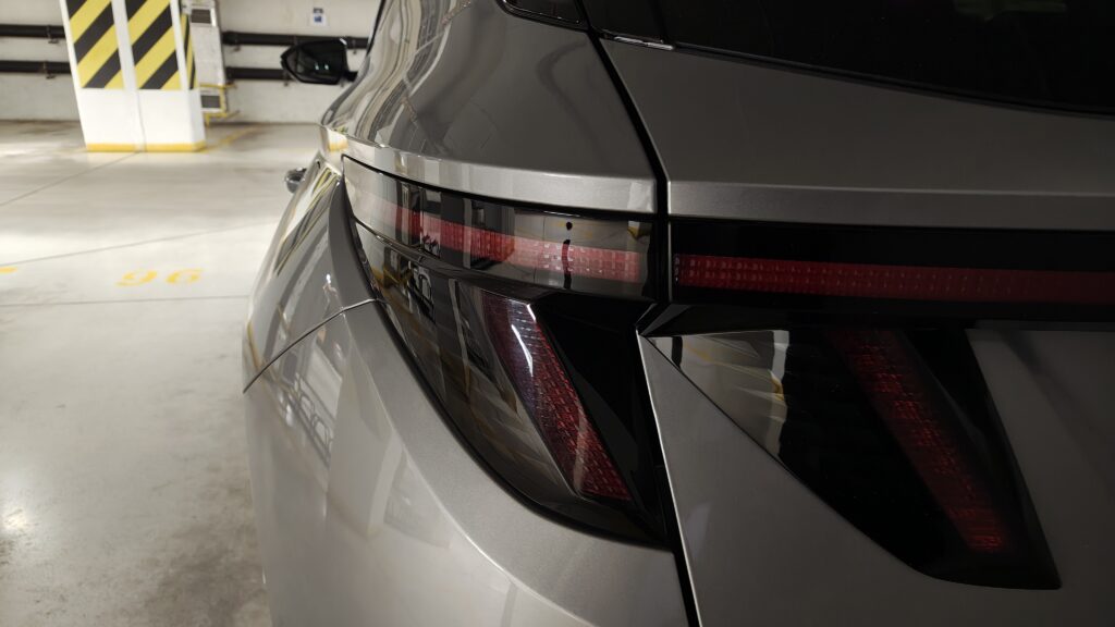 Tył samochodu kontynuuje ten futurystyczny trend, prezentując się niezwykle szeroko i nowocześnie. Najważniejszym elementem jest tutaj listwa świetlna LED biegnąca przez całą szerokość klapy bagażnika, która łączy dwa zestawy pionowych lamp przypominających kły drapieżnika. Ciekawostką stylistyczną i technologiczną jest logo Hyundaia umieszczone na szkle tylnej szyby, a nie na karoserii, oraz wycieraczka, którą sprytnie ukryto pod spoilerem dachowym, co zapewnia czystość formy. Pod względem wymiarów Tucson urósł w porównaniu do poprzednika – mierzy teraz 4500 mm długości, 1865 mm szerokości oraz 1650 mm wysokości, przy rozstawie osi wynoszącym 2680 mm. Różnica względem poprzedniej generacji jest kolosalna; tamten model był obły i zachowawczy, podczas gdy nowy jest muskularny, kanciasty i znacznie bardziej wyrazisty, co sprawia, że wygląda na auto o klasę wyższe.