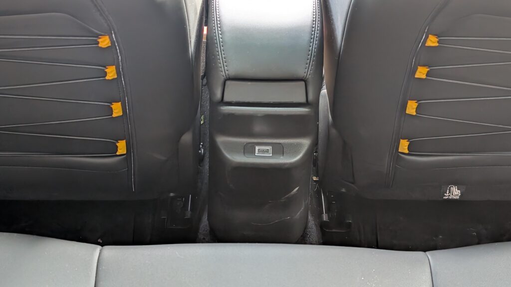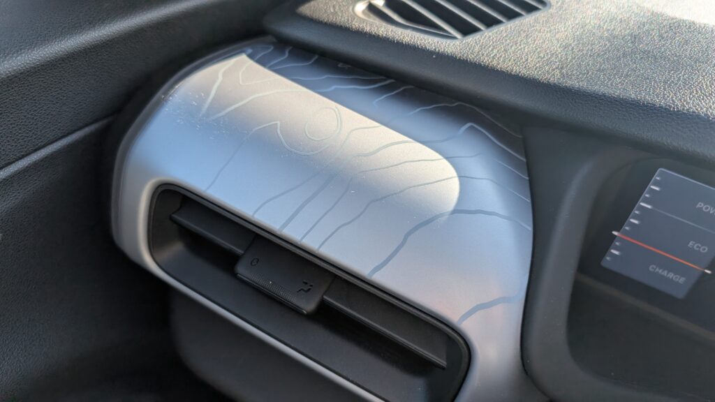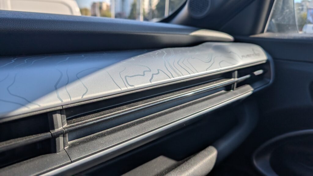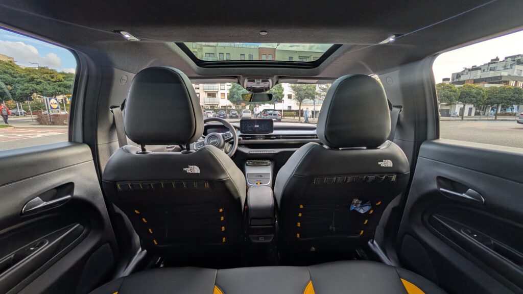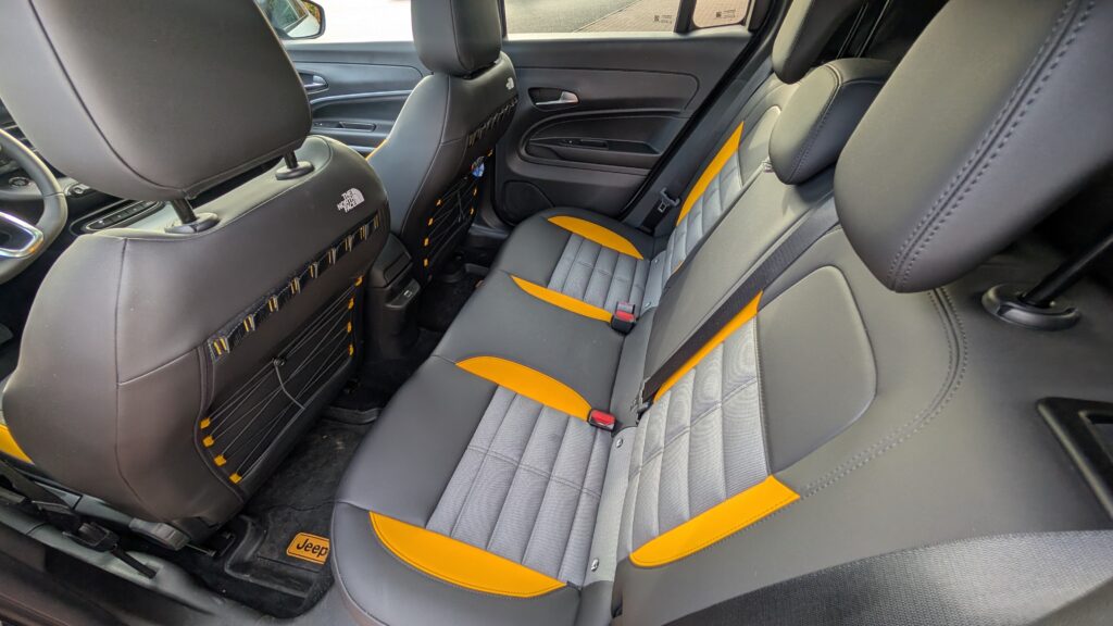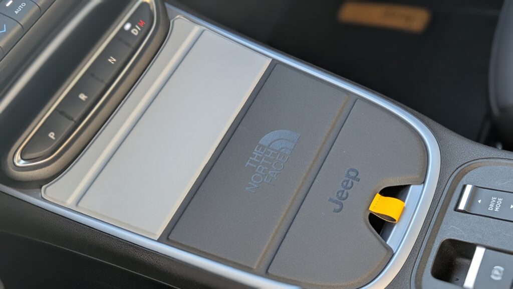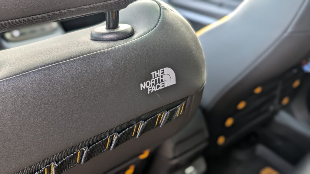 Wnętrze Avengera 4xe w edycji The North Face przeszło transformację, wnosząc świeży design i wyższą funkcjonalność. Kluczowym elementem są specjalne fotele, których design inspirowany jest kultowymi puchowymi kurtkami amerykańskiej marki, wykonane z wytrzymałej, wodoodpornej tapicerki z detalami w kolorze Summit Gold. Tył przednich foteli wyposażono w elastyczne paski, nawiązujące do pasków plecaków The North Face, co jest praktycznym i estetycznym smaczkiem. Pomimo dominacji twardych plastików w kokpicie, jakość montażu nie budzi zastrzeżeń, a szare nakładki na desce rozdzielczej z motywem topograficznym oraz żółte wstawki tworzą spójny i pomysłowy design. Standardem wyposażenia są dwa 10,25-calowe wyświetlacze, a pomimo braku nawiewów dla pasażerów z tyłu, znajdą oni tam port USB-C. Kierowca i pasażerowie mają do dyspozycji dużą liczbę schowków oraz specjalny schowek z magnetyczną osłoną, który kryje ładowarkę indukcyjną, działającą nawet przez grube etui telefonu. Warto jednak odnotować, że przestrzeń na nogi na tylnej kanapie jest ograniczona, a bagażnik w wersji 4xe jest mniejszy niż w odmianach przednionapędowych, oferując 325 litrów pojemności.