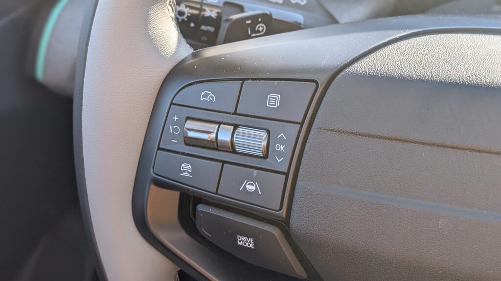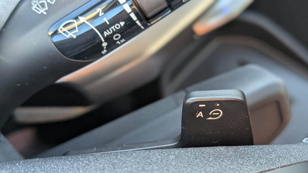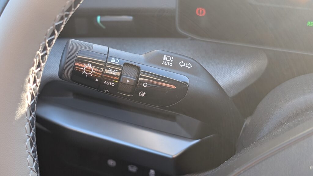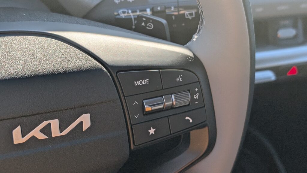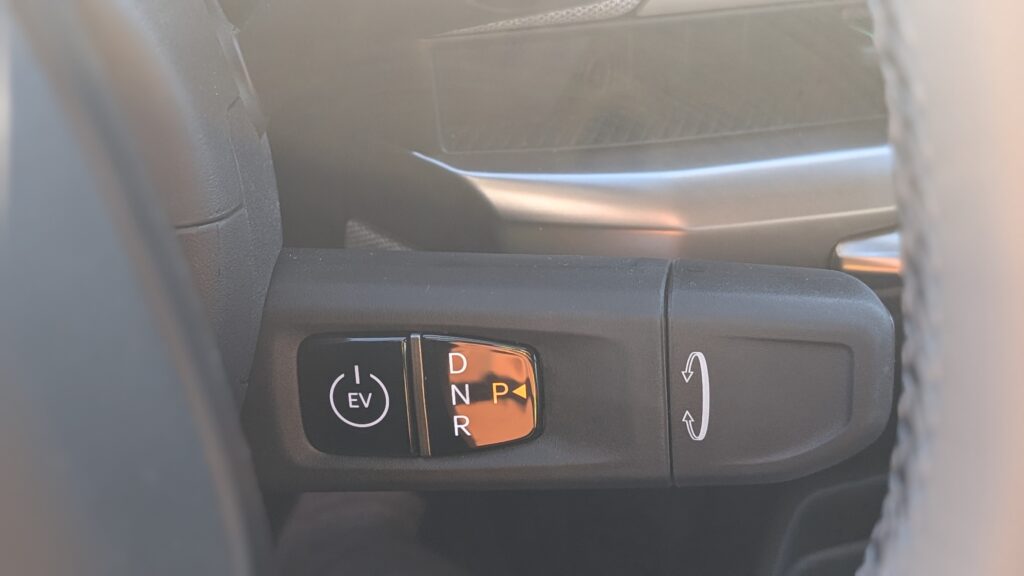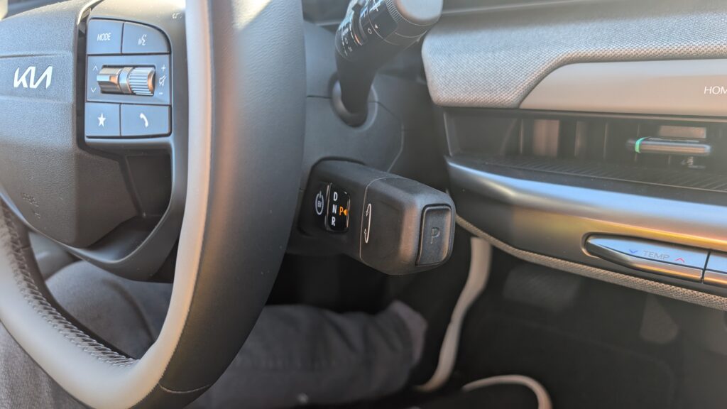 Gdy wsiadłem do KIA EV4, zacząłem szukać przycisku Start, nie było go na kolumnie kierownicy, nie widziałem go też na środkowym tunelu i nie znalazłem go też na desce rozdzielczej. Pomyślałem, że prawdopodobnie wystarczy wrzucić bieg na D, żeby ruszyć, podobnie jak jest w innych elektrykach. Jednak Kia nie drgnęła, zegary nadal były zgaszone. Przestałem nerwowo obmacywać kokpit, usiadłem spokojnie ogarnąłem wzrokiem całą deskę rozdzielczą i zacząłem spokojnie analizować, wszelkie przyciski, przełączniki i pokrętła. Nadal nic. Nie poddałem się, powiedziałem sobie, że muszę sam dojść do tego, jak uruchomić EV4. Nagle, przyglądając się drążkowi do zmiany biegów na kierownicy, dostrzegłem, nieduży przycisk, schowany sprytnie z mało wymownym symbolem EV w kółeczku. Przycisk jest praktycznie nie widoczny z pozycji kierowcy. Jest wyczuwalny i łatwo dostępny, ale tylko wtedy, gdy się o nim wie. Po 4 minutach poszukiwań i niemal całkowitej kompromitacji udało mi się uruchomić napęd.