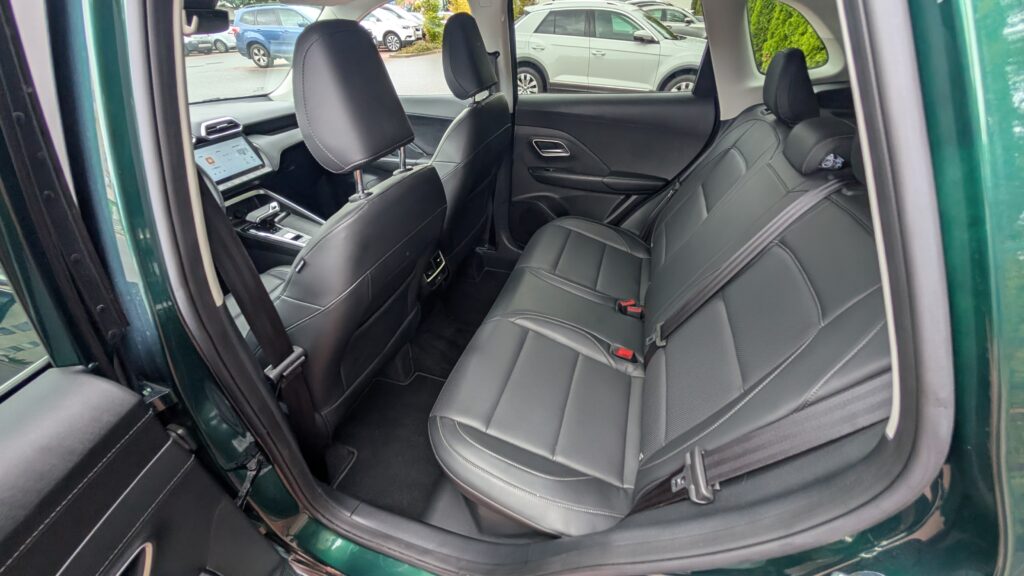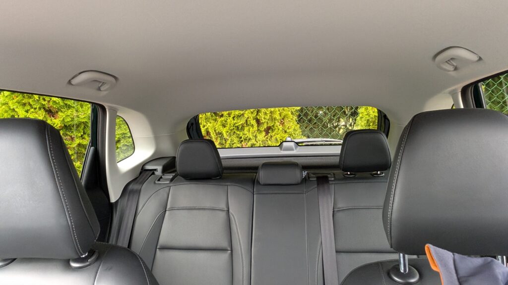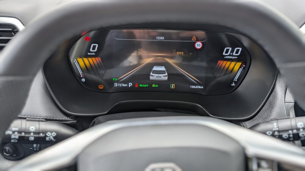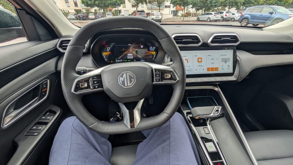 Pozytywnym zaskoczeniem jest jakość wykończenia wnętrza, szczególnie z przodu. Zastosowano tu miękkie, przyjemne w dotyku materiały na desce rozdzielczej, a nawet na górnych częściach boczków drzwi, co jest rzadko spotykane w tej klasie cenowej. Osobiście wolę jaśniejsze wnętrza, bo całość w czerni optycznie pomniejsza kabinę robi ja mniej przyjemną dla oka, ale to kwestia gustu. Kierownica multimedialna jest, ale część przycisków po lewej stronie nie działa, udało mi się tylko jeden konfigurowalny ustawić. Nie udało mi się też uruchomić tempomatu, więc możliwe, że go nie było na pokładzie, ale z drugiej strony, po co przyciski na kierownicy? Nie do końca spodobały mi się liczne grafiki na ekranie za kierownicą. Na jego większej części jest zdjęcie samochodu, a po jego obu bokach zbędne pomarańczowe grafiki przedstawiające jakieś zapory. Kluczowe informacje czyli prędkość i obroty silnika wyświetlane są cyfrowo w obu skrajnych rogach ekranu. Wyświetlacz centralny spełnia swoją funkcję, ale wiele opcji jest dostępnych tylko z poziomu tabletu, co może powodować odrywanie wzroku od jezdni. Pod ekranem znajdziemy 7 fizycznych przycisków, ale żaden z nich nie obsługuje nawiewu czy klimatyzacji. Zaskakująco dobrze działa wbudowana nawigacja i choć nie znajduje wszystkich obiektów tak jak Google Maps to sam interface i podpowiedzi zjazdów są bardzo przejrzyście podane. Mimo tych drobiazgów MG ZS Hybrid + wnętrze jest całkiem przytulne, miękkie i przestronne.
