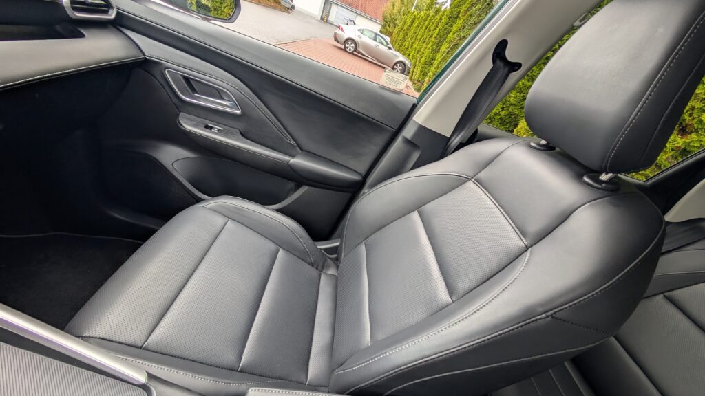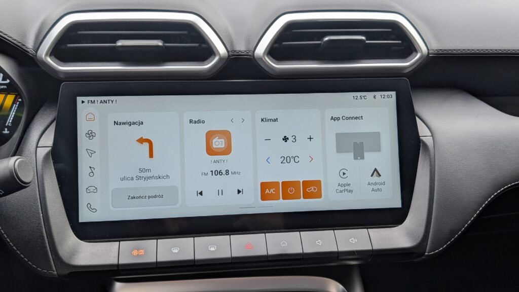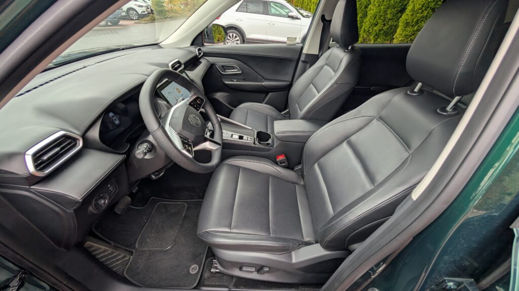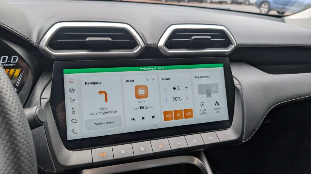 Jednak za tym dobrym pierwszym wrażeniem wizualnym kryją się drobne i niepotrzebne sprzeczności, których można było uniknąć. Trochę przeszkadza możliwość regulacji kierownicy tylko w płaszczyźnie góra-dół. Podgrzewanie kierownicy i foteli jest jednostopniowe, czyli albo ogrzewania działa na maksa, albo jest wyłączone. Musze też przyznać, że po 10 minutach fotele grzeją zbyt mocno. Android Auto i Apple CarPlay działają wyłącznie po podłączeniu kabla i to w dodatku na stare duże złącze USB-A, natomiast z małego możemy tylko ładować smartfona. Problem w tym, że kabli z USB-A już nawet nie dostajemy z nowymi telefonami. Fotel pasażera jest całkowicie manualny, a stopniowanie pochylenia oparcia ma dość duże skoki, przez co trudno ustawić odpowiednią pozycję i jest to opinia dwóch osób, które jechały ze mną kolejno po sobie. Trochę więc ponarzekałem, ale dobrze wiem, że w wyższym modelu MG HS tych problemów nie ma. Czy zatem faktycznie chodzi o cenę? Możliwe, że tak, w końcu za niecałe 100 tyś. złotych nie możemy mieć wszystkiego.