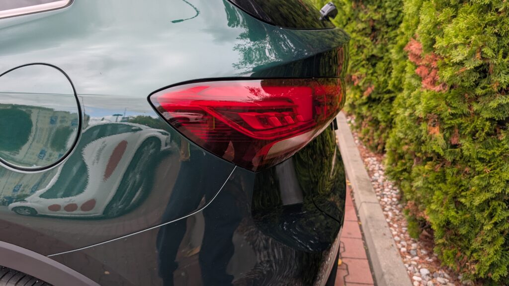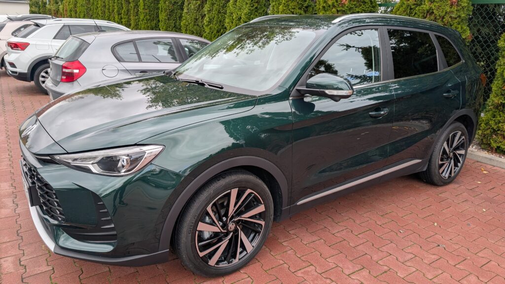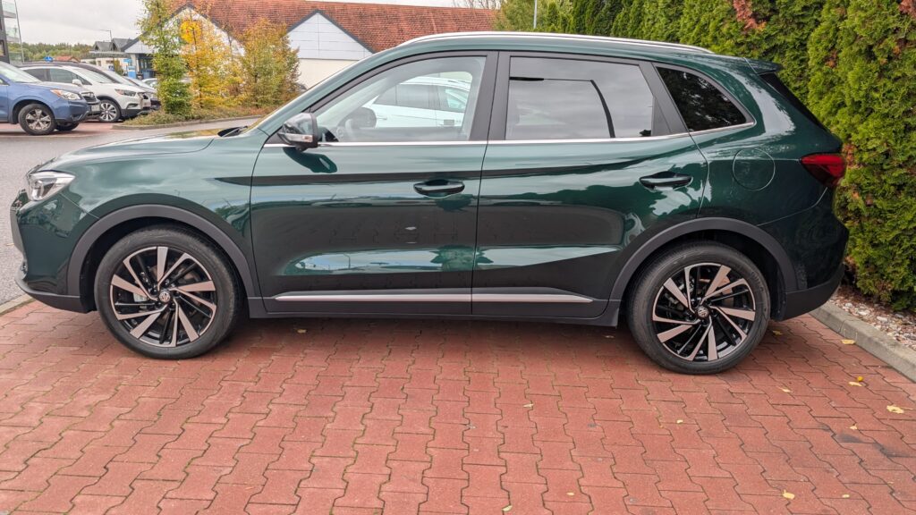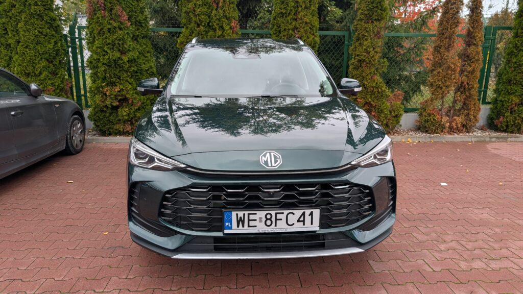 Wizualnie samochód prezentuje się całkiem dobrze i choć momentami przypomina SUVa BMW, to jednak tego sprzed kilku lat. Mimo tego można stwierdzić, że MG ZS Hybrid+ prezentuje się jako nowoczesny i pewny siebie kompaktowy SUV, którego design został dostosowany do aktualnych europejskich trendów. Ma solidną, podwyższoną sylwetkę typową dla segmentu B-SUV, ale jego linie są eleganckie i uniwersalne, dzięki czemu samochód może podobać się szerokiemu gronu odbiorców. Aerodynamiczny kształt i dynamiczne detale, takie jak dostępne w wyższych wersjach relingi dachowe czy większe felgi aluminiowe, nadają mu sportowego sznytu i sprawiają, że na drodze wygląda na auto większe niż jest w rzeczywistości. Przód samochodu cechuje się wyrazistą i szeroką atrapą chłodnicy, która dominuje w centralnej części, nadając pojazdowi drapieżny i odważny wygląd. Z każdej strony kraty umieszczono smukłe, ostro zarysowane reflektory, które w wyższych wersjach wykorzystują technologię LED, co zapewnia nowoczesną i skuteczną iluminację drogi. Dynamiczne przetłoczenia na masce płynnie łączą się z linią przedniego zderzaka, a akcenty stylistyczne, chromowane lub w kolorze satynowego aluminium, podkreślają terenowy charakter pojazdu. Patrząc na boki MG ZS Hybrid+, uwagę przykuwa dynamiczna linia dachu, która delikatnie opada ku tyłowi, choć nie w stopniu coupe-SUV-a, a jej profil wieńczą srebrne relingi dachowe dostępne w wyższych wariantach. Wyraźne, lecz płynne przetłoczenia nadają drzwiom trójwymiarowości, a solidne nadkola podkreślają sylwetkę typową dla SUV-a. W zależności od wybranej wersji wyposażenia, samochód może być wyposażony w 16-calowe felgi stalowe z kołpakami, 17-calowe felgi aluminiowe lub duże 18-calowe felgi aluminiowe o charakterystycznym, wzmocnionym wzorze, które dopełniają muskularny wizerunek. Tył kompaktowego SUV-a jest proporcjonalny i solidny, z wyraźnie zarysowanym spojlerem dachowym, który dodaje sportowego akcentu i poprawia aerodynamikę. Kształt tylnej klapy zaprojektowano z myślą o funkcjonalności, zapewniając łatwy dostęp do bagażnika. Światła tylne, częściowo lub w pełni wykonane w technologii LED, mają nowoczesny, dwusegmentowy wzór i zachodzą na boki nadwozia, optycznie poszerzając pojazd.