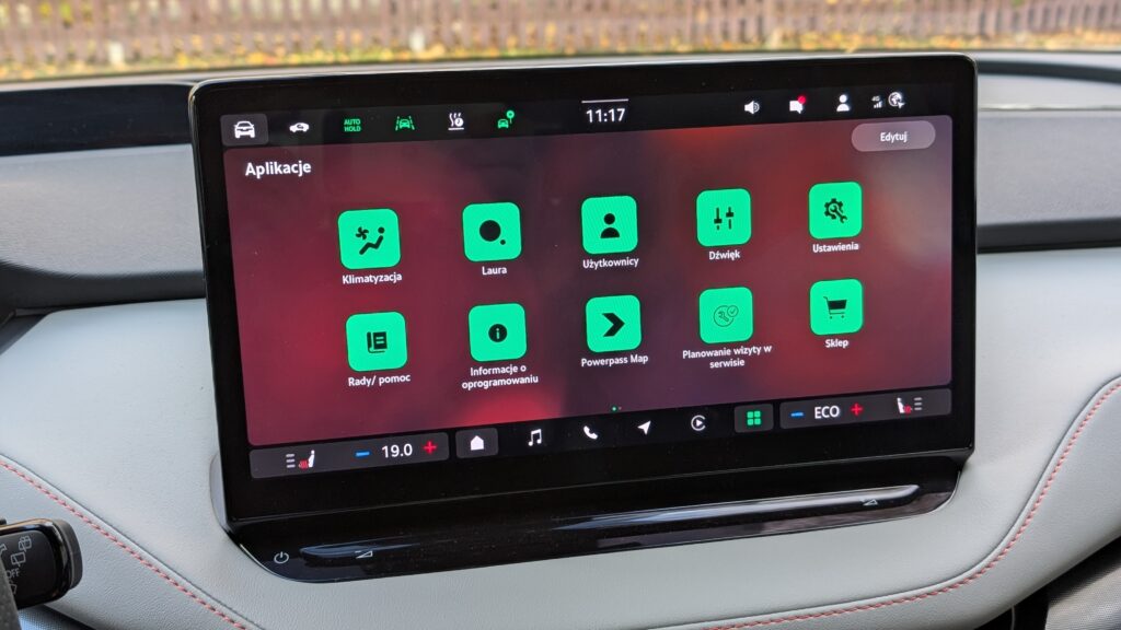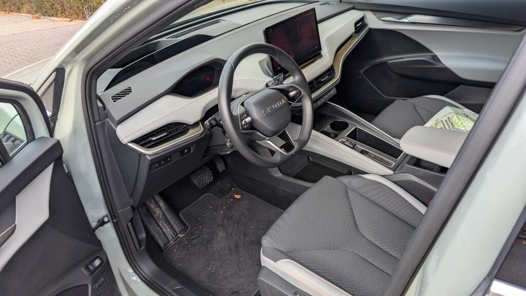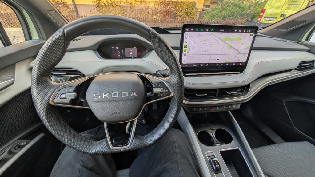 Wnętrze Elroqa to miejsce, w którym technologia spotyka się z relaksem. Skoda postawiła na połączenie czystego, minimalistycznego designu z materiałami, które są po prostu przyjemne w dotyku. To idealna przestrzeń, by naładować baterie. Cały kokpit to hołd dla ergonomii i intuicyjności. Zamiast gąszczu przycisków, dominuje spokój i dwa ekrany. Tuż za kierownicą czeka na Ciebie mały, cyfrowy asystent – kluczowe informacje pojawiają się w mgnieniu oka, idealnie czytelne i konfigurowalne, by nie rozpraszały. Sercem dowodzenia jest jednak duży, ekran dotykowy (nawet 13 cali!), który działa jak osobisty tablet. Stąd zarządzamy wszystkim – od listy ulubionych playlist, przez precyzyjną nawigację, aż po temperaturę w kabinie. A teraz najlepsze: materiały. Skoda zadbała o to, abyśmy czuli się dobrze z naszym wyborem. Część tapicerki wykonana jest z szarej tkaniny, co jest nie tylko stylowe, ale i ekologiczne – to ukłon w stronę natury, dzięki zastosowaniu innowacyjnych materiałów z recyklingu. Fotele? Zaprojektowane z myślą o naszym kręgosłupie! Są perfekcyjnie wyprofilowane, oferując przytulne wsparcie boczne, dzięki czemu nawet najdłuższa trasa zamienia się w komfortową podróż. Wszystko jest tam, gdzie powinno być, na wyciągnięcie ręki. Po prostu wsiadasz i jedziesz, czując się od razu jak w domu.