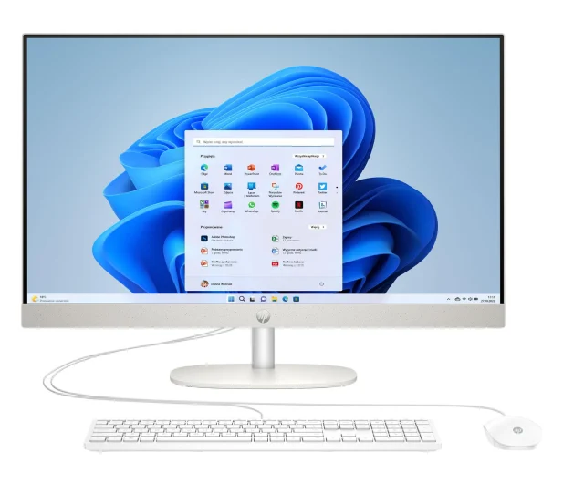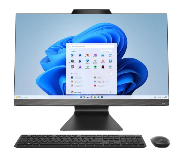 Ekran Full HD o rozdzielczości 1920 x 1080 z panelem IPS dostarcza żywe kolory i szerokie kąty widzenia. Sprawdzi się więc przy pracy i konsumpcji multimediów „po godzinach”. Matowa powierzchnia ogranicza refleksy świetlne co pomaga w komfortowym korzystaniu w słoneczne dni. W zestawie z komputerem serwowane są bezprzewodowa klawiatura i mysz, co pozwala od razu zacząć pracę bez konieczności podłączania dodatkowych akcesoriów. System operacyjny Windows 11 Home jest już zainstalowany więc urządzenie jest gotowe do użytku od pierwszego uruchomienia.