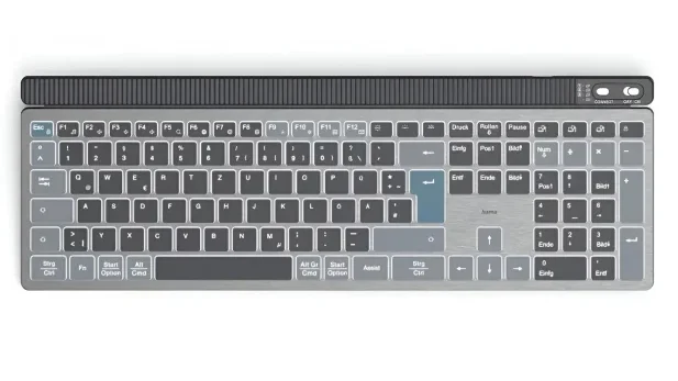 Klawiatura Hama WK 750 została zaprojektowana jako narzędzie do pracy na wielu urządzeniach jednocześnie. Oferuje trzy kanały komunikacji, w tym dwa przez Bluetooth oraz jeden radiowy z odbiornikiem USB, co pozwala szybko przełączać się między komputerem, tabletem i smartfonem. Mechanizm nożycowy zapewnia ciche i precyzyjne pisanie, a regulowane podświetlenie ułatwia pracę po zmroku. Konstrukcja wykorzystuje elementy aluminiowe, dzięki czemu całość jest solidna i estetyczna.