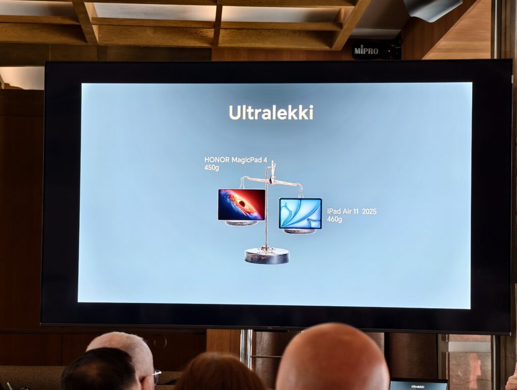 Centralnym punktem wydarzenia był HONOR MagicPad4, określany przez producenta jako najcieńszy tablet na świecie. Konstrukcja o grubości zaledwie 4,8 mm i wadze około 450 g robi wrażenie nie tylko na papierze – HONOR wyraźnie podkreślał, że smukłość nie odbyła się kosztem sztywności ani wydajności.