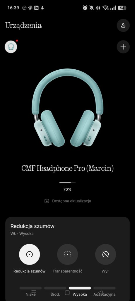 W codziennych scenariuszach słuchawki spisują się nieźle. ANC całkiem skutecznie tłumi niepotrzebne dźwięki z zewnątrz wtedy, gdy chcemy się od nich odciąć. Tryb transparentny przydaje się, gdy trzeba coś załatwić w sklepie albo usłyszeć zapowiedź przystanku, ale nie brzmi naturalnie – głos otoczenia bywa trochę zniekształcony. Mimo to różnica między trybami jest wyraźna, więc łatwo dostosować słuchawki do sytuacji. Warto też wspomnieć o solidnej stabilności Bluetooth 5.4 – zasięg jest bardzo dobry, a żadne krótkie przerwy w transmisji nie psują przyjemności ze słuchania. W domu i biurze CMF Headphone Pro wypadają jeszcze lepiej. To sprzęt, który nie męczy. Dźwięk jest klarowny. Podczas rozmów głosowych mikrofony sprawują się poprawnie – głos jest wyraźny, choć momentami brakuje mu trochę naturalności.