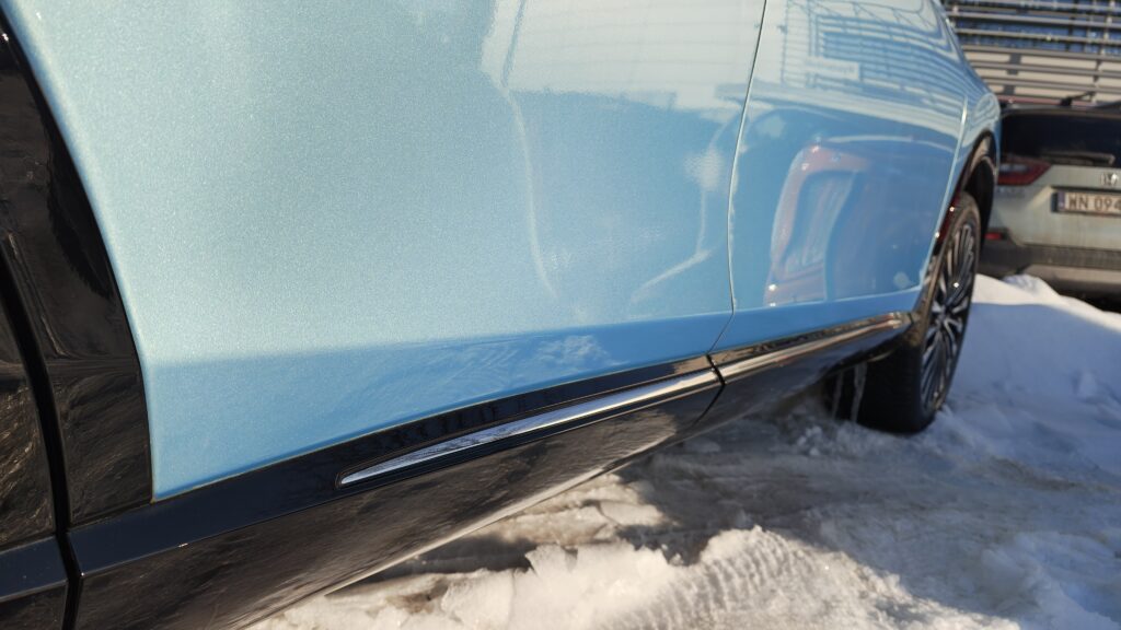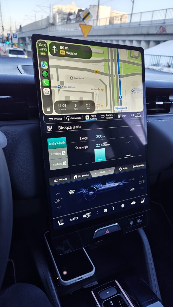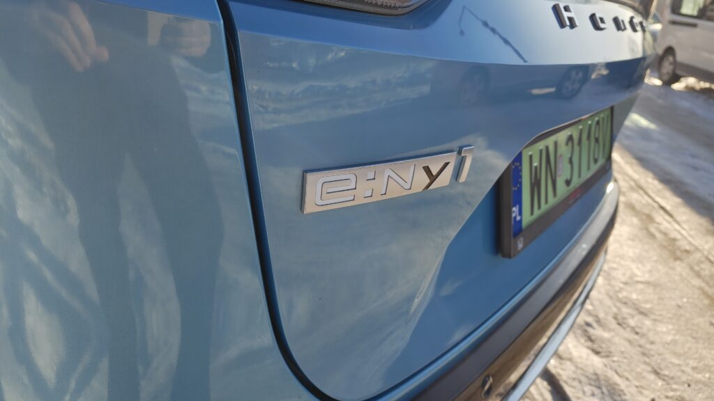 Testowana wersja e:Ny1 napędzana jest przez zaawansowany silnik elektryczny umieszczony z przodu, który generuje moc 204 KM oraz maksymalny moment obrotowy wynoszący 310 Nm. Wspomaganie układu kierowniczego jest precyzyjne i progresywne, a zintegrowany moduł napędowy współpracuje świetnie z jednostopniową przekładnią automatyczną, która zapewnia błyskawiczną reakcję na gaz i aksamitną gładkość przyspieszania w każdym zakresie prędkości. Całość zasilana jest akumulatorem litowo-jonowym o pojemności 68,9 kWh brutto, co pozwala na przejechanie ponad 400 kilometrów na jednym ładowaniu według normy WLTP latem, ale zimą przy obecnych mrozach zasięg spadł do 250 km. Co prawda można wydłużyć zasięg, jeżeli jest taka potrzeba, ale odbywa się to kosztem systemów „podtrzymywania życia” czyli ogrzewania. Po wytłoczeniu go, komputer natychmiast pokazuje zasięg o 80 do 90 km dłuższy.