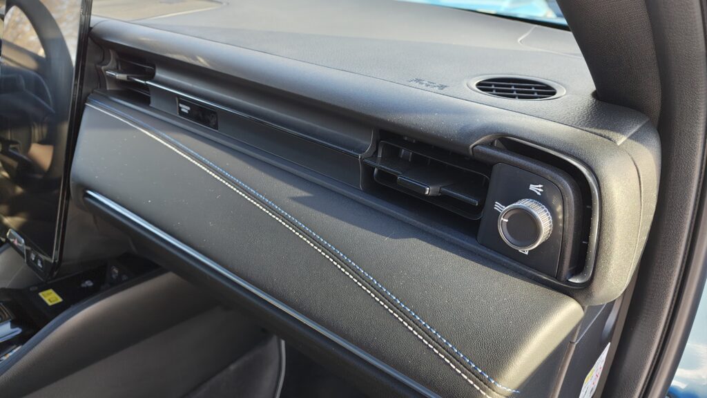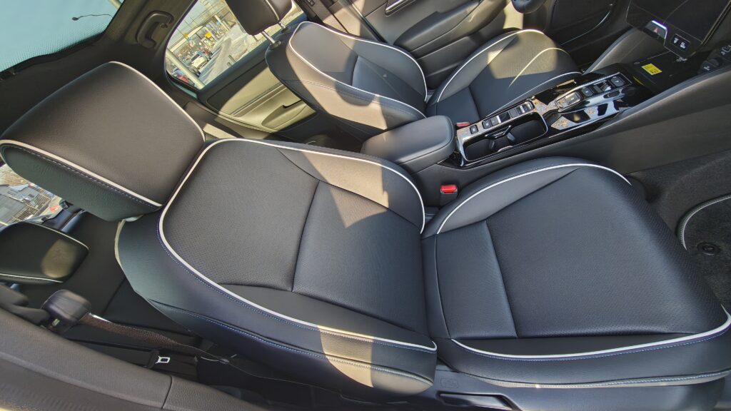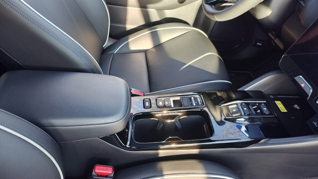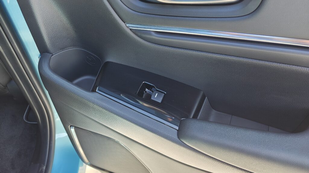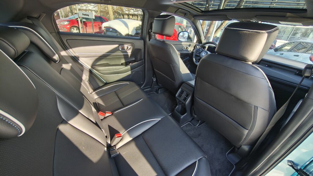 Ogólny wygląd kabiny e:Ny1 emanuje spokojem i wysoką jakością wykonania, oferując poziom komfortu godny segmentu premium. Przestronność wnętrza jest duża, zwłaszcza na tylnej kanapie, gdzie płaska podłoga pozwala na wygodną podróż trzem dorosłym osobom, a duża ilość miejsca na nogi sprawia, że nawet długie trasy są znośne. Tapicerka na desce rozdzielczej oraz górne panele drzwi zostały wyłożone miękkimi materiałami o przyjemnej fakturze, często uzupełnionymi o błękitne podświetlenie nastrojowe, które buduje unikalny klimat po zmroku. Fotele pokryto dobrej jakości skórą syntetyczną, która jest nie tylko trwała i łatwa w pielęgnacji, ale również zapewnia świetne podparcie boczne i wysoki komfort termiczny, co w połączeniu z dobrym wyciszeniem kabiny tworzy idealne warunki do codziennej eksploatacji.
