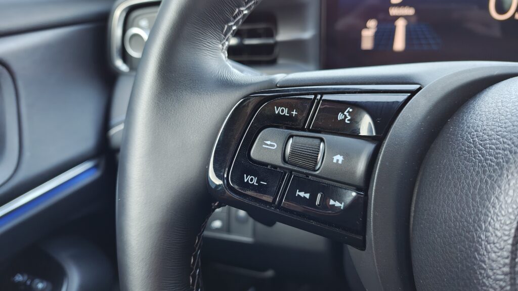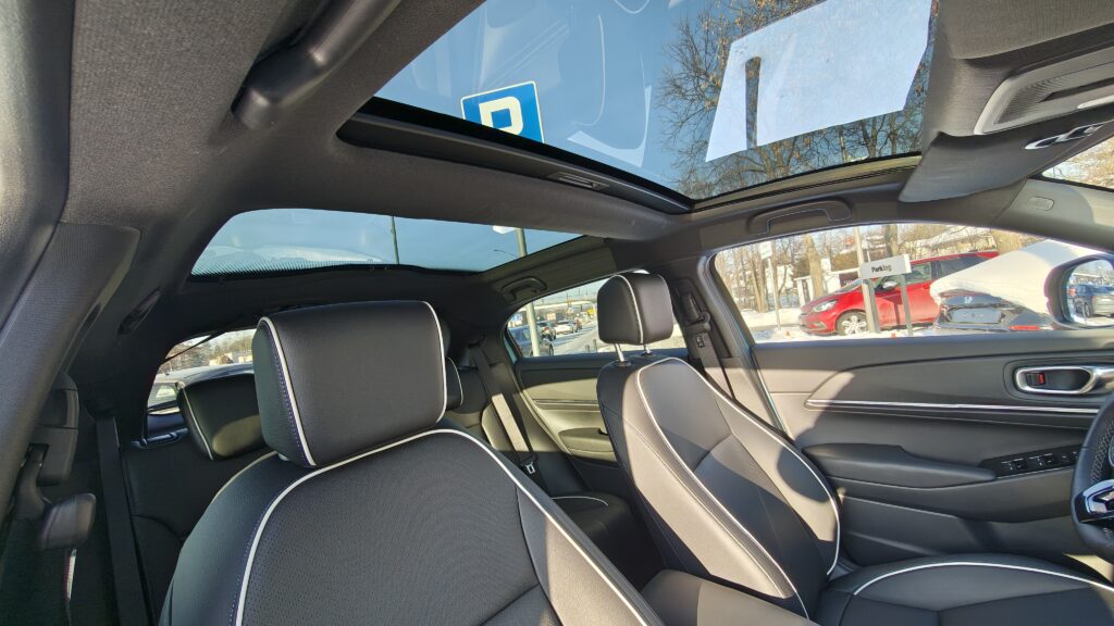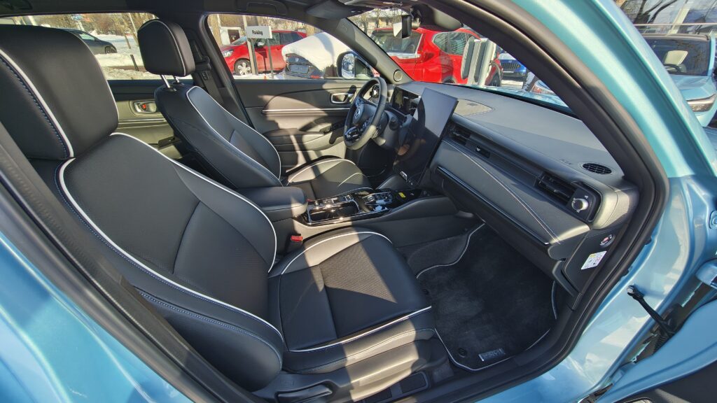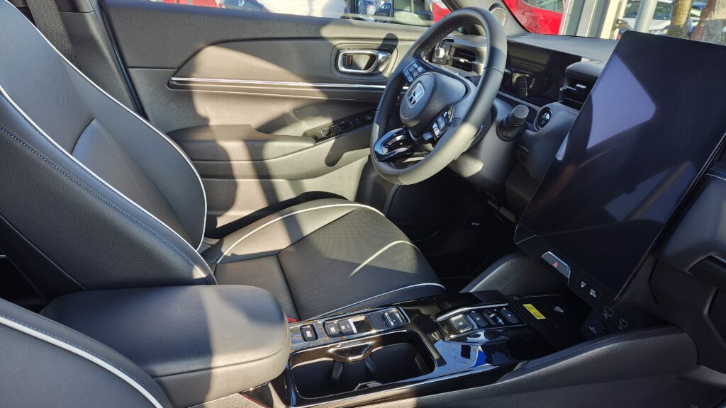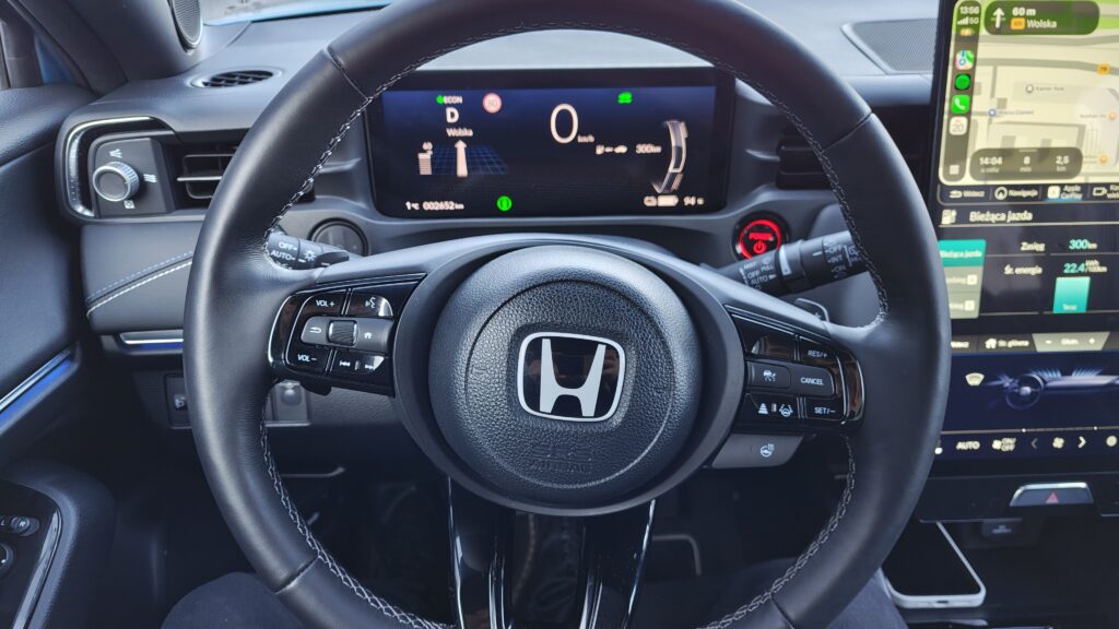 Wnętrze Hondy e:Ny1 w porównaniu do spalinówek przeszło radykalną metamorfozę, stając się prawdziwym futurystycznym pojazdem, w którym pierwsze skrzypce gra pionowy, 15,1-calowy ekran dotykowy podzielony na trzy funkcjonalne strefy. Kierowca ma przed sobą nowoczesną, trójramienną kierownicę z nowym logotypem oraz 10,2-calowy wyświetlacz cyfrowych zegarów, który dostarcza wszystkich niezbędnych informacji o stanie baterii i parametrach jazdy w niezwykle czytelny sposób. Deska rozdzielcza została zaprojektowana horyzontalnie, co potęguje wrażenie szerokości kabiny, a jej centralna część pozbawiona jest zbędnych przycisków, gdyż większość funkcji przeniesiono do systemu multimedialnego. Na konsoli środkowej zachowano jednak fizyczne przełączniki do najczęściej używanych funkcji, natomiast na obudowie tunelu między siedzeniami znajdziemy selektor kierunku jazdy w formie nowoczesnych przycisków, ładowarkę indukcyjną do smartfonów oraz dwa porty USB-C, co sprawia, że przestrzeń ta jest niezwykle uporządkowana i ergonomiczna.