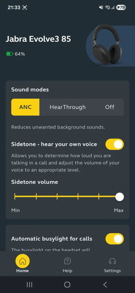Jabra Evolve3 85 korzystają z aplikacji Jabra Plus, która pełni rolę centrum zarządzania słuchawkami. Interfejs jest przejrzysty i nieprzeładowany funkcjami, co sprzyja codziennemu użytkowaniu. Aplikacja pozwala na podstawową personalizację dźwięku, zmianę trybów redukcji hałasu, kontrolę ustawień mikrofonu oraz aktualizację oprogramowania.