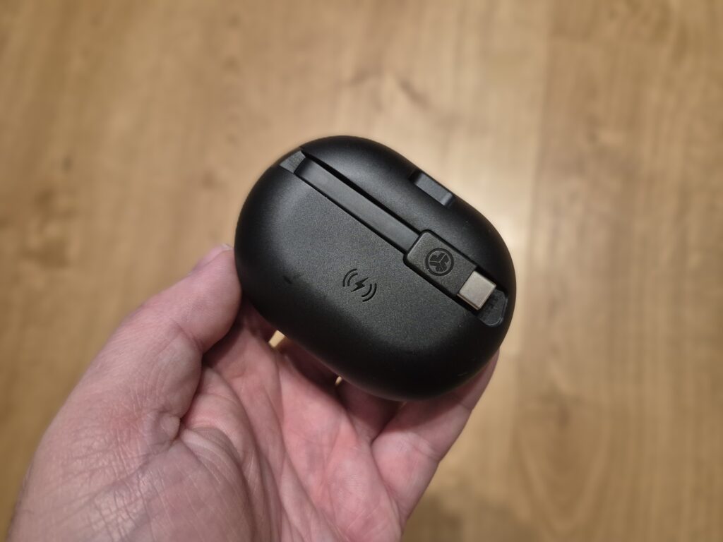 Pierwszy kontakt ze słuchawkami od razu zdradza ich sportowy charakter. Konstrukcja z pałąkiem jest bardziej masywna niż w klasycznych pchełkach, ale jednocześnie solidna i dobrze wykonana. Tworzywa są matowe i dobrze spasowane. Etui wygląda trwale, choć jest większe niż w typowych modelach true wireless. Jego zintegrowany przewód do ładowania to praktyczne rozwiązanie. Nie jest to jednak game changer, ponieważ obecnie często nosimy przy sobie kabel USB-C ze względu na to, że powszechnie korzystamy z niego w przypadku całej podręcznej elektroniki.