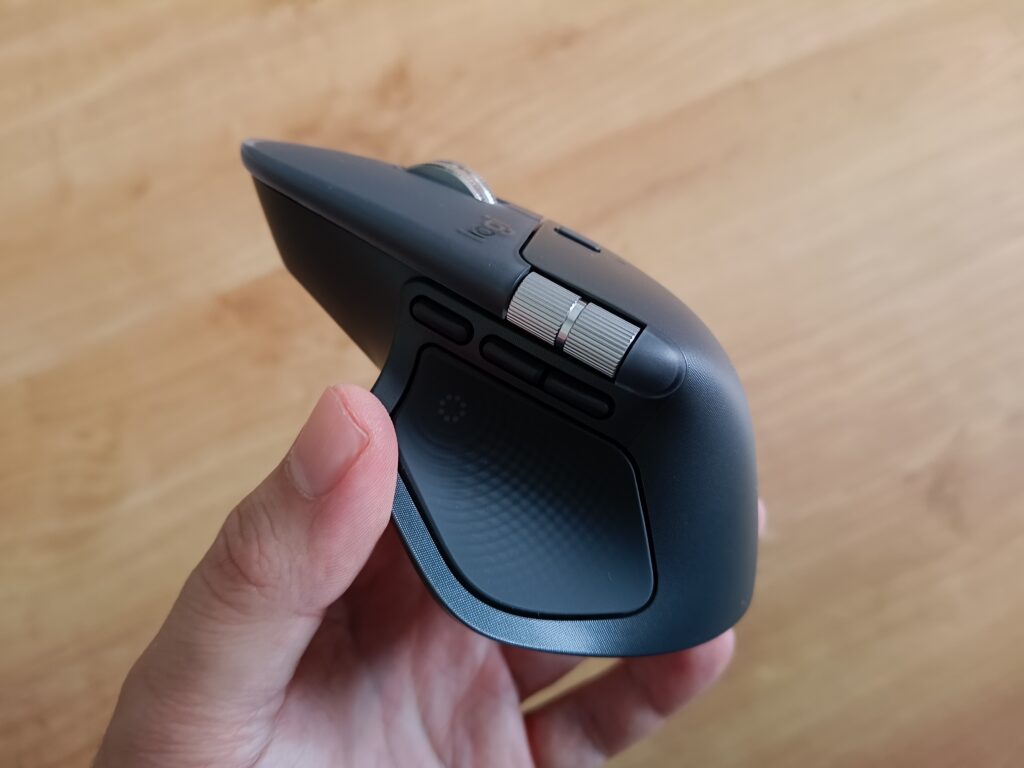 Jedną z największych nowości w Logitech MX Master 4 jest panel dotykowy umieszczony w obszarze pod kciukiem. To rozwiązanie zastępuje część klasycznych przycisków gestami, które użytkownik może wykonywać w naturalny sposób – przesunięcie palca w górę, dół czy na boki aktywuje różne funkcje, takie jak przełączanie aplikacji, przewijanie czy otwieranie przypisanych skrótów. Co istotne, panel nie działa „na ślepo” – towarzyszy mu haptyczne sprzężenie zwrotne, które wyraźnie sygnalizuje, że gest został poprawnie rozpoznany.