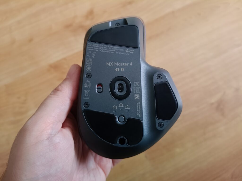 Logitech MX Master 4 obsługuje zarówno łączność Bluetooth, jak i połączenie przez odbiornik Logi Bolt. Dzięki temu można łatwo dopasować sposób korzystania do własnych preferencji – jedni wolą prostotę Bluetooth, inni stawiają na stabilność dedykowanego adaptera. Co ważne, mysz można sparować jednocześnie z kilkoma urządzeniami, a następnie przełączać się między nimi przy pomocy niewielkiego przycisku umieszczonego na spodzie obudowy.