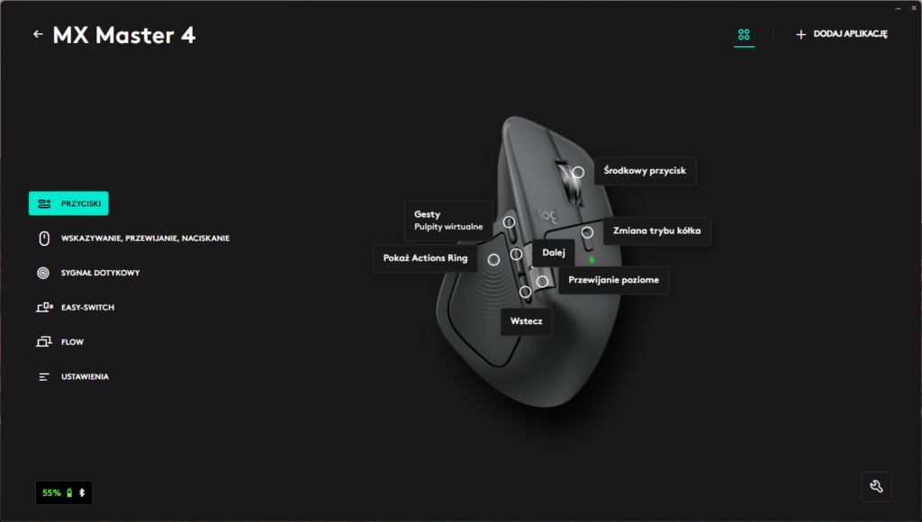 Aby w pełni wykorzystać możliwości Logitech MX Master 4, konieczne jest zainstalowanie aplikacji Logi Options+. To właśnie w niej można skonfigurować wszystkie dodatkowe funkcje – od przypisywania akcji do poszczególnych przycisków, przez obsługę panelu dotykowego, aż po ustawienia Action Ring. Oprogramowanie jest przejrzyste i intuicyjne, choć oferuje na tyle dużo opcji, że osoby mniej zaawansowane mogą poczuć się przytłoczone.