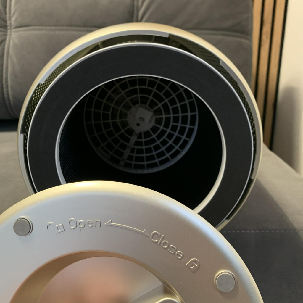 Wlot 360° i paraboliczny wylot 45° to jednak nie cała historia, którą producent próbuje opowiedzieć. Ważne jest, co użytkownik może zrobić z tym złotym nawiewem. Nietypowy moduł sterujący „w kształcie gaiki ocznej”, gdzie w trybie ręcznym można regulować pracę poprzez nacisk/zmianę kąta, a do wyłączenia przesuwa się moduł tak, by przycisk zasilania był skierowany ku górze. Z perspektywy ergonomii to ciekawy pomysł bo zamiast typowego pokrętła czy suwaka, mamy interakcję „dotykaj i ustawiaj” oraz wizualny „język buziek”.