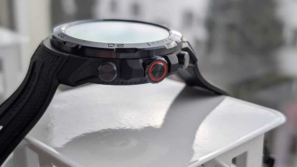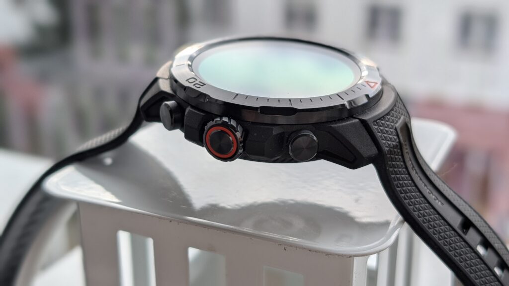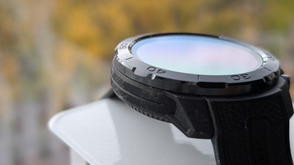 Zegarek jest dostępny w trzech kolorach i w każdym wygląda dobrze, osobiście uważam, że w bieli wygląda najlepiej a dodatkowo wyróżnia się tym kolorem na tle konkurencji. Przechodząc płynnie do ekranu, jego zewnętrzna warstwa to ekran Corning® Gorilla®. Producent nie chwali się która to wersja, więc można założyć, że nie najnowsza, ale w dalszym ciągu jest to solidna ochrona renomowanej marki. Dotykowy ekran ma 1.32″, rozdzielczość 466×466 pikseli i jest to AMOLED o jasności do 1500 nitów. To taka jasność, że w słoneczny dzień, bez większych problemów odczytamy dane z ekranu. Ponieważ przyciski do nawigacji mamy tylko trzy, to do obsługi najlepiej używać dotykowego ekranu. Jednak jest on responsywny i mówiąc szczerze, nie ustępuje on w codziennej obsłudze swoim starszym braciom. Po prostu działa tak, jak trzeba i nie ma się do czego przyczepić.