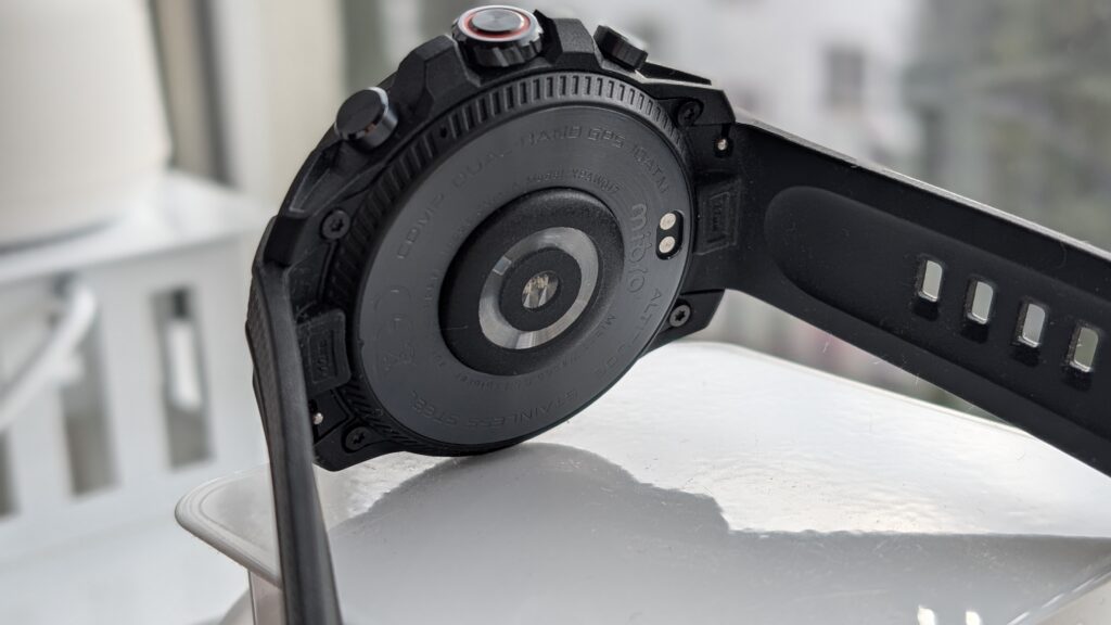 Ustalmy na początku jedno, Mibro GS Explorer to smartwatch za 449 zł, zatem jest to jeden z tańszych zegarków na rynku, ale co ciekawe wyglądem przypomina swoją konkurencję ze średniej i wyższej półki. Nie jest to jedynie wrażenie zaczerpnięte z pięknego rendera czy dobrze wyświeconego zdjęcia. Mibro GS Explorer na serio prezentuje się bardzo ładnie. Koperta w rozmiarze 47.8mm, a więc spora i masywna, została wykonana z wzmocnionego tworzywa sztucznego, natomiast bezel ze stali nierdzewnej, która zawsze wygląda świetnie, błyszczy i dodaje +100 do wyglądu każdego przedmiotu. Koperta jest gruba na 13.1mm, a całość waży solidne 67,5g. Jedni powiedzą, że za ciężki, bo to, bo tamto, ale waga często wynika z zastosowania lepszych, bardziej wytrzymałych materiałów. Nie znam nikogo, kto by powiedział, że Garmin Fenix, Tag Heuer albo inny flagowy Huawei jest za ciężki. Dlatego szukając wytrzymałego smartwatcha i decydując się na wszystko odporną cegłę, należy zaakceptować słuszne wymiary i wagę zegarka. Absolutnie nie przyrównuje Mibro GS Explorer do zegarków z najwyższej półki, ale zwracam uwagę, że jego rozmiar, waga wynikają z funkcji jaką ma pełnić. Co ciekawe, dekiel czyli ta część z czujnikami, która przylega do naszego nadgarstka została wykonana też z nierdzewnej stali. Taka konstrukcja sprawia, że zegarek nie tylko prezentuje się dobrze ale faktycznie jest w stanie znieść niecodzienne warunki.