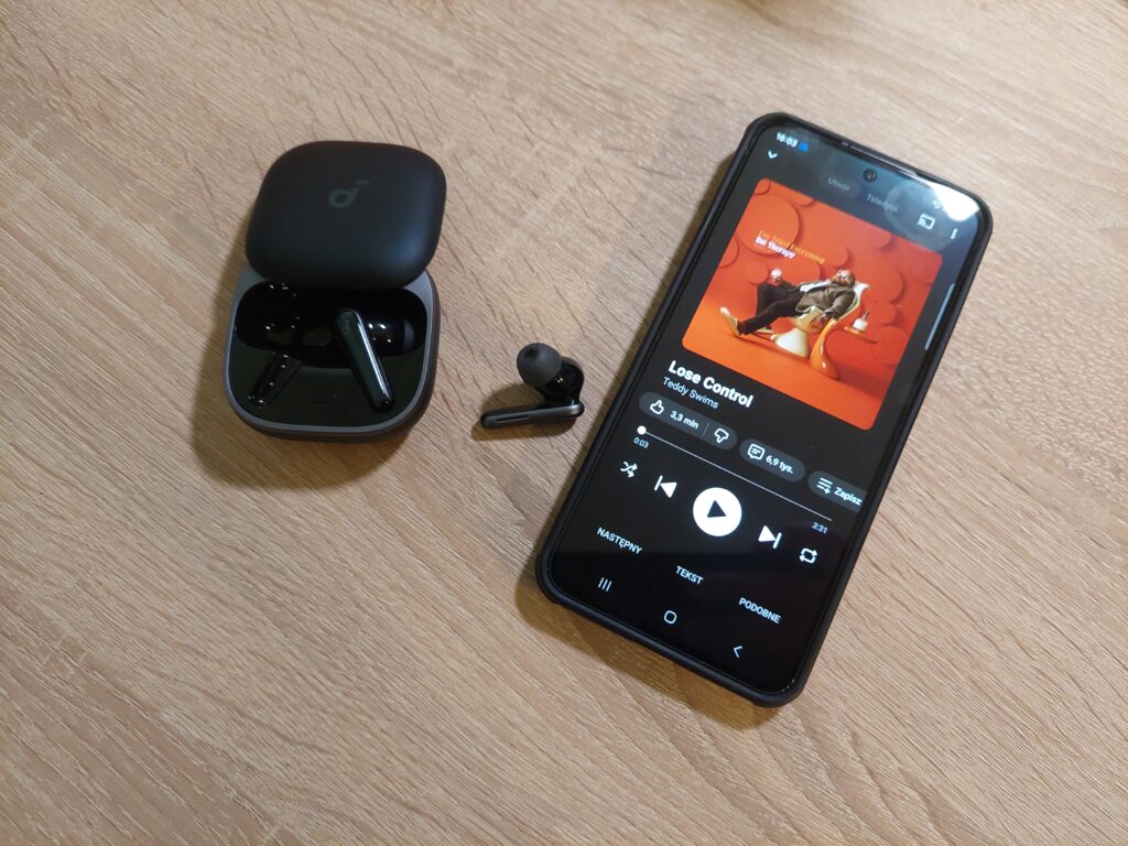 Naturalnym punktem odniesienia dla soundcore Liberty 5 są dziś inne popularne modele ze średniej półki, wśród których często pojawiają się Samsung Galaxy Buds3 FE oraz realme Buds Air7 Pro. W porównaniu z propozycją Samsunga Liberty 5 wypadają bardziej uniwersalnie pod względem charakteru brzmienia i funkcjonalności. Galaxy Buds3 FE stawiają na bezpieczne, dość zachowawcze granie i bardzo dobrą integrację z ekosystemem producenta, ale poza nim tracą część swojej atrakcyjności. Soundcore oferuje większą swobodę personalizacji, skuteczniejsze ANC w zmiennych warunkach i bardziej efektowny dźwięk, który po korekcji potrafi być wyraźnie bardziej angażujący.
