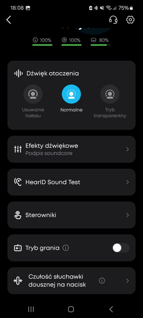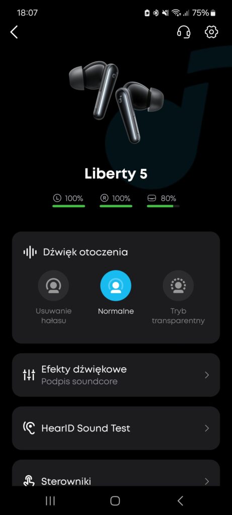 Aplikacja soundcore od lat uchodzi za jedną z najlepiej zaprojektowanych w segmencie słuchawek bezprzewodowych i w przypadku Liberty 5 nie jest inaczej. Interfejs jest czytelny, logicznie uporządkowany i pozwala szybko dotrzeć do wszystkich kluczowych ustawień. Użytkownik ma pełną kontrolę nad trybami redukcji hałasu, transparentnością oraz profilem dźwięku, bez konieczności przeklikiwania się przez zbędne menu.