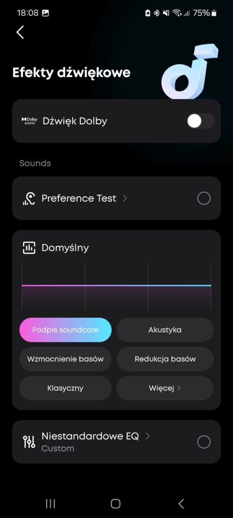 Na szczęście aplikacja soundcore daje szerokie możliwości personalizacji brzmienia. Korektor graficzny pozwala skutecznie skorygować zarówno nadmiar basu, jak i zbyt agresywne wysokie tony. Po odpowiednim dostrojeniu Liberty 5 potrafią zabrzmieć znacznie bardziej neutralnie i uniwersalnie, co czyni je słuchawkami elastycznymi i łatwymi do dopasowania do własnych preferencji.