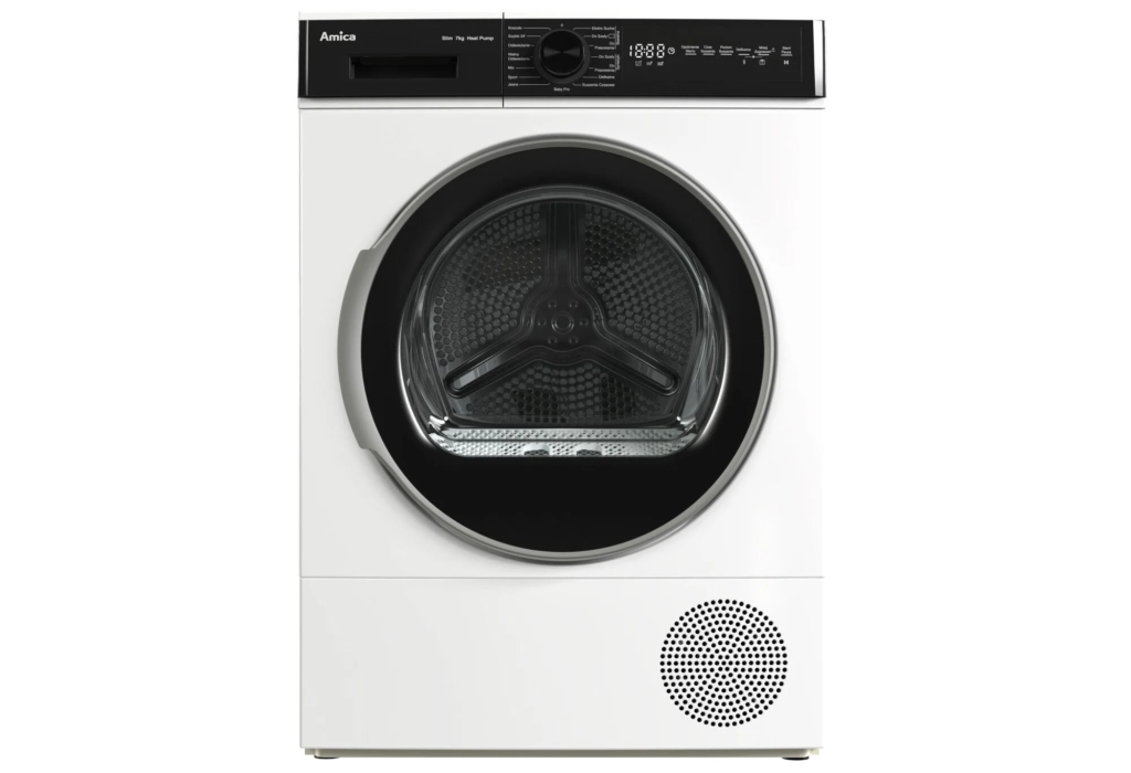 Suszarka Amica AD3S72LEB to wolnostojący model typu slim o głębokości 46 cm (52,5 cm z elementami wystającymi), który przy wyraźnie ograniczonych gabarytach oferuje bęben o pojemności 7 kg. To wyróżnia ją na tle wielu konkurencyjnych konstrukcji o podobnej głębokości, zwykle ograniczających się do 6 kg. Urządzenie ma wymiary 59,6 × 84,5 × 46 cm i zostało zaprojektowane z myślą o małych łazienkach, wąskich wnękach oraz ustawieniu na pralce przy użyciu dedykowanego łącznika, co w segmencie slim jest rozwiązaniem praktycznym, choć nieunikającym kompromisów konstrukcyjnych. AD3S72LEB wykorzystuje technologię pompy ciepła, która ogranicza temperaturę suszenia. Obieg powietrza zamyka natomiast w jednym układzie, co realnie obniża zużycie energii oraz zmniejsza obciążenie tkanin w porównaniu z klasycznymi suszarkami grzałkowymi. W tej klasie cenowej i gabarytowej nie jest to już jednak rozwiązanie unikatowe. Na starszych etykietach energetycznych urządzenie klasyfikowano jako A++, co według aktualnych norm odpowiada klasie E, z deklarowanym zużyciem energii około 211 kWh rocznie, czyli 1,33 kWh na cykl przy pełnym załadunku, co plasuje ten model powyżej starszych konstrukcji A+ i F, ale jednocześnie wyraźnie poniżej najnowszych i bardziej zaawansowanych suszarek konkurencyjnych marek. Te przy podobnej pojemności potrafią zejść z realnym zużyciem energii jeszcze niżej.