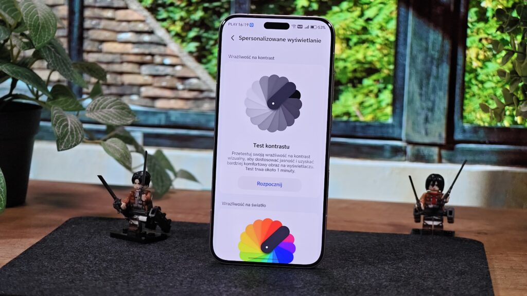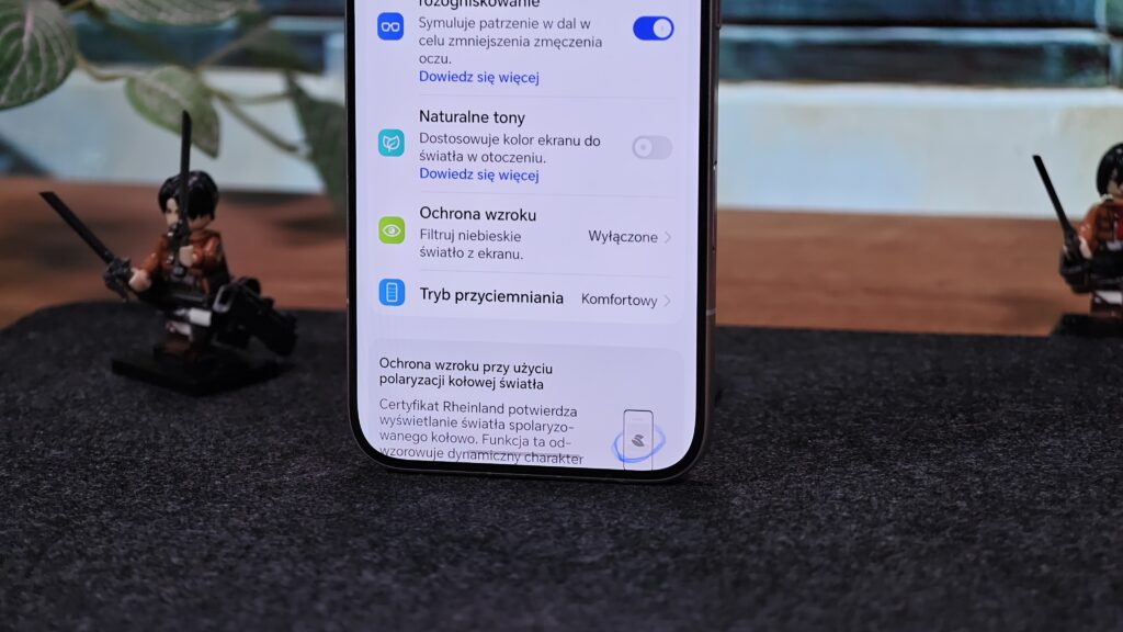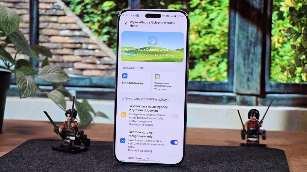 Ale jest też łagodna dla oczu bardzo wysoka – 4320 Hz – częstotliwość ściemniania ekranu, kołowy filtr polaryzacyjny nadający światłu „naturalność”, czy wreszcie coś, co podoba mi się szczególnie: wprowadzane co jakiś czas delikatne rozmycie obrazu udające patrzenie w dal, skłaniające oko do zmiany ogniskowej i rozluźnienie mięśni. Lekarze zalecają robienie przerw od ekranu i patrzenie na coś odległego, ale nigdy o tym nie jestem w stanie pamiętać. …a tu, Honor robi to za ciebie.