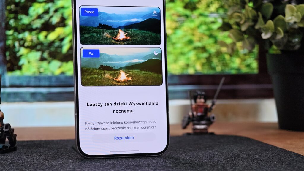 Ekran ma potężną jasność szczytową na poziomie 6000 nitów (fragment ekranu przy wysokim kontraście itp.) i świetnie radzi sobie nawet w bardzo jasnym otoczeniu, ale czymś, co zwraca uwagę są funkcje zdrowotne. Eliminacja światła niebieskiego? Wiadomo, standard. Można włączyć, wyłączyć, ustawić harmonogram…